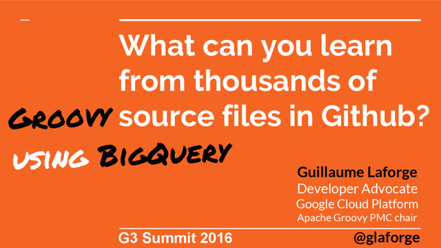 Guillaume will show you some concrete examples from the dataset, with examples applied to the Apache Groovy language, to learn more about our programming habits. And figure out on your own about your favorite language, web framework and build tool usage patterns!
