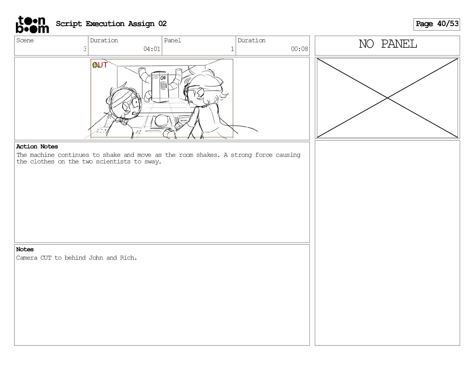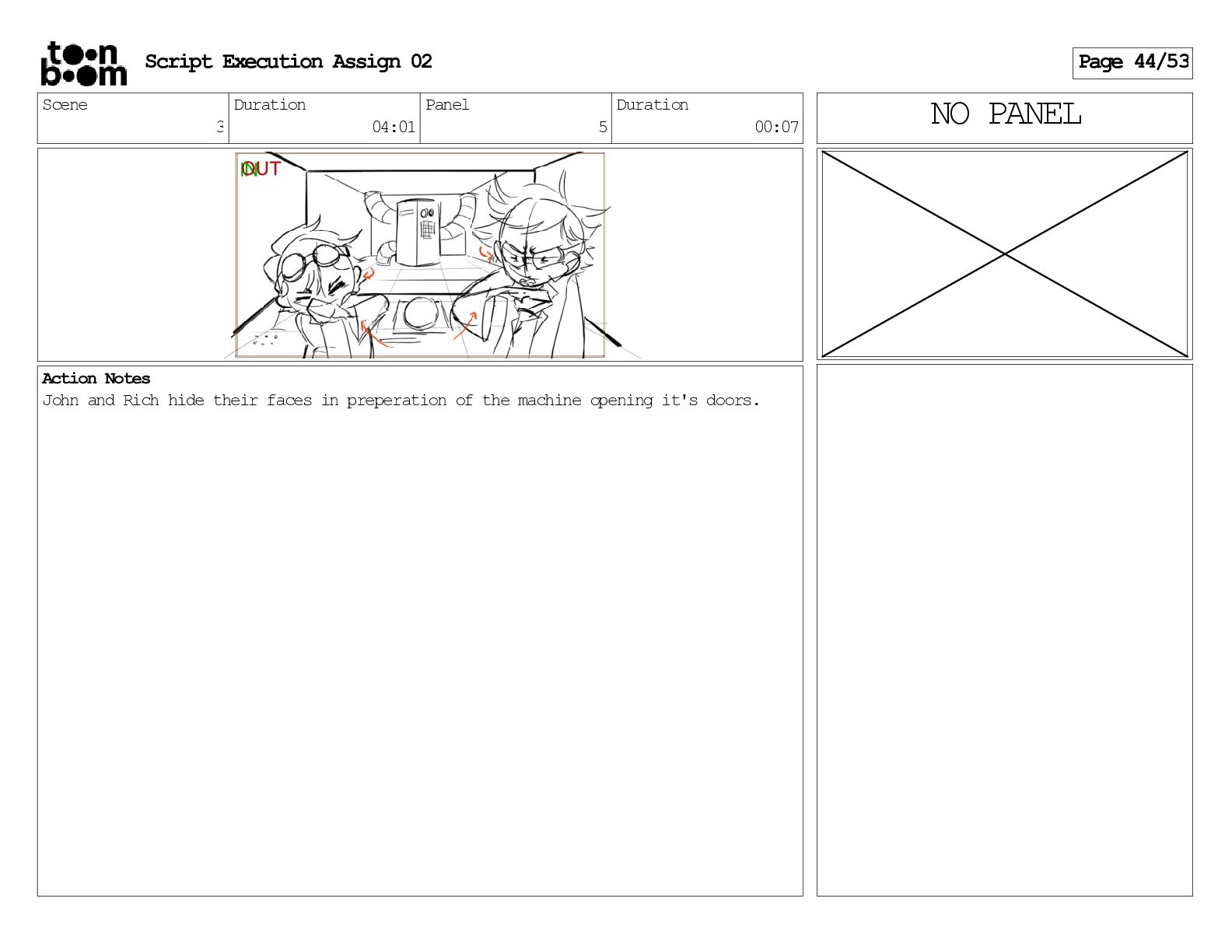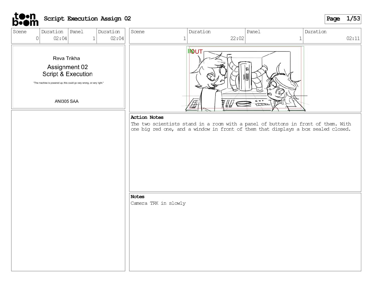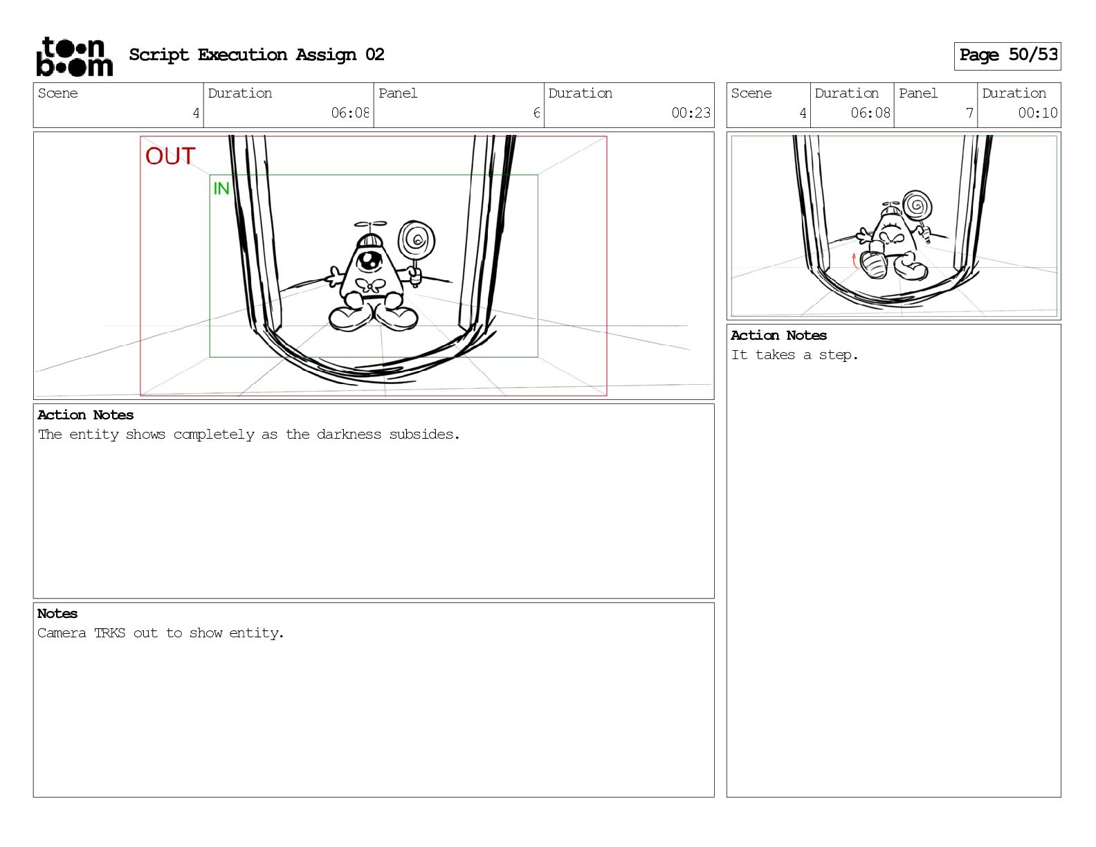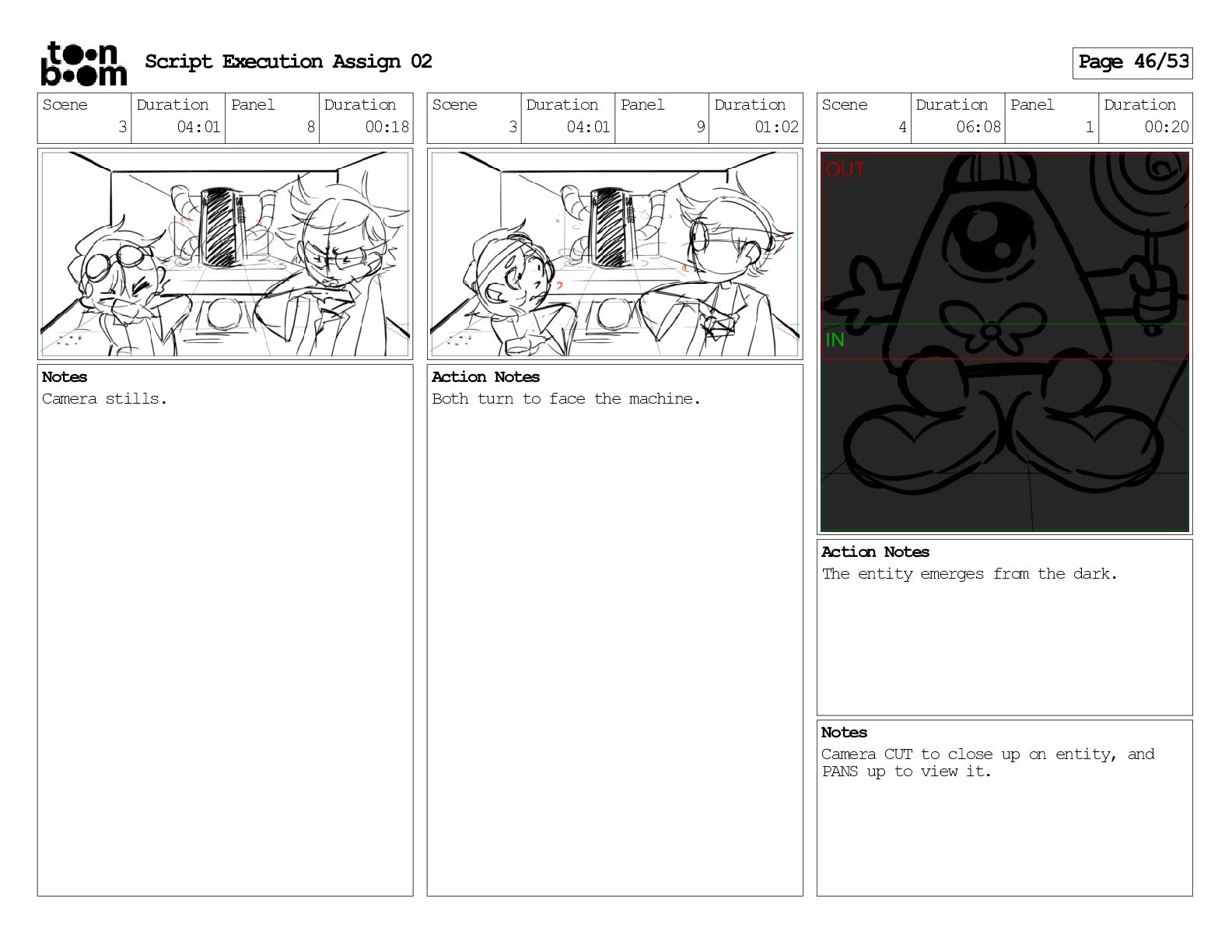 stills. Scene 3 Duration 04:01 Panel 9 Duration 01:02 Action Notes Both turn to face the machine. Scene 4 Duration 06:08 Panel 1 Duration 00:20 Action Notes The entity emerges from the dark. Notes Camera CUT to close up on entity, and PANS up to view it. Script Execution Assign 02 Page 46/53
