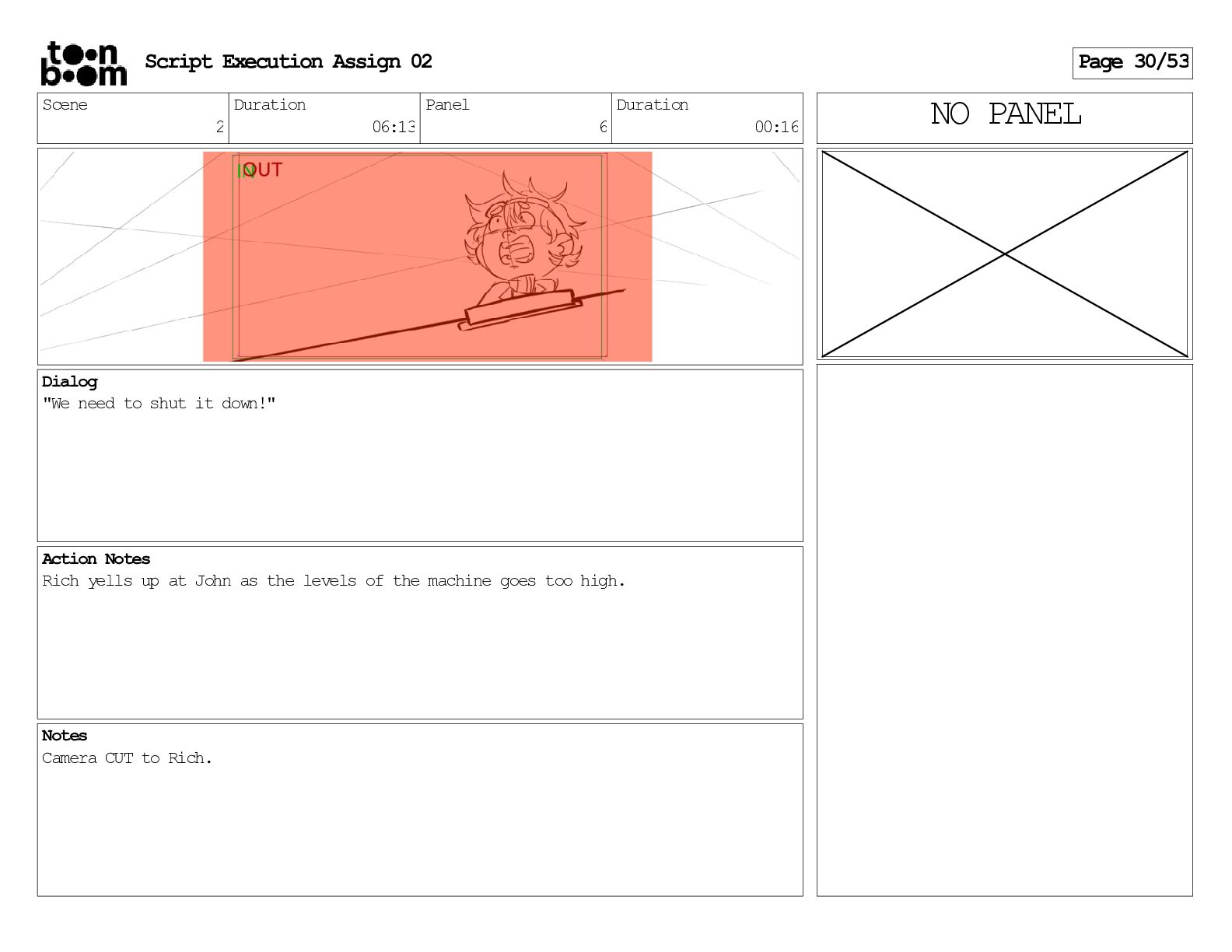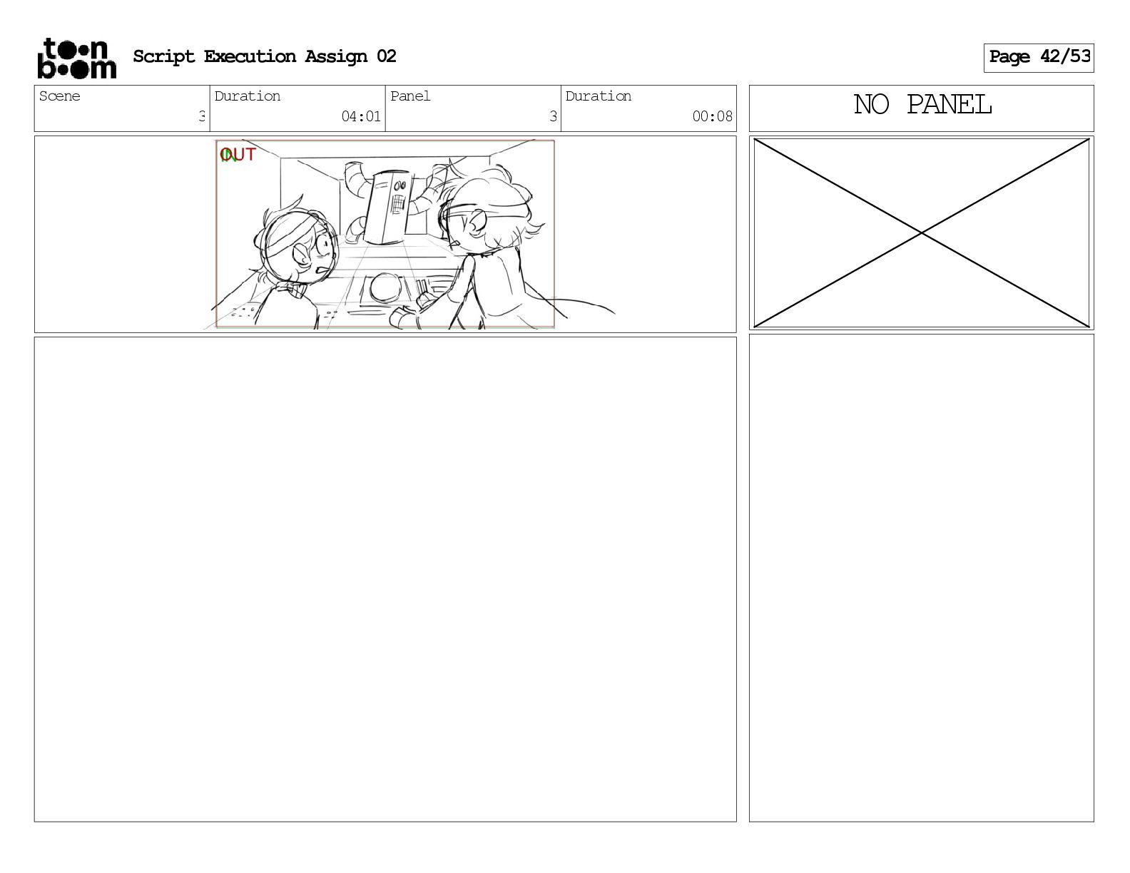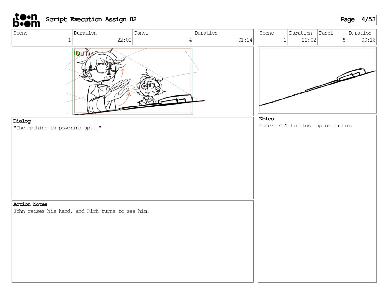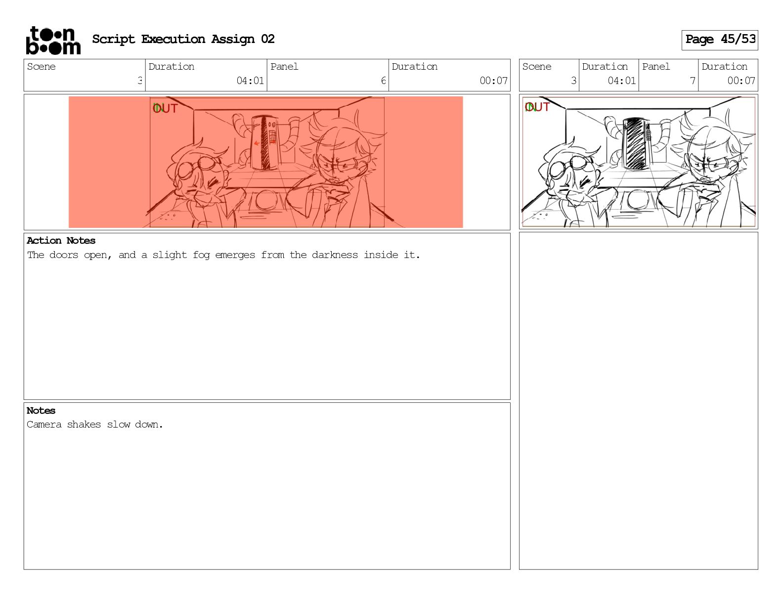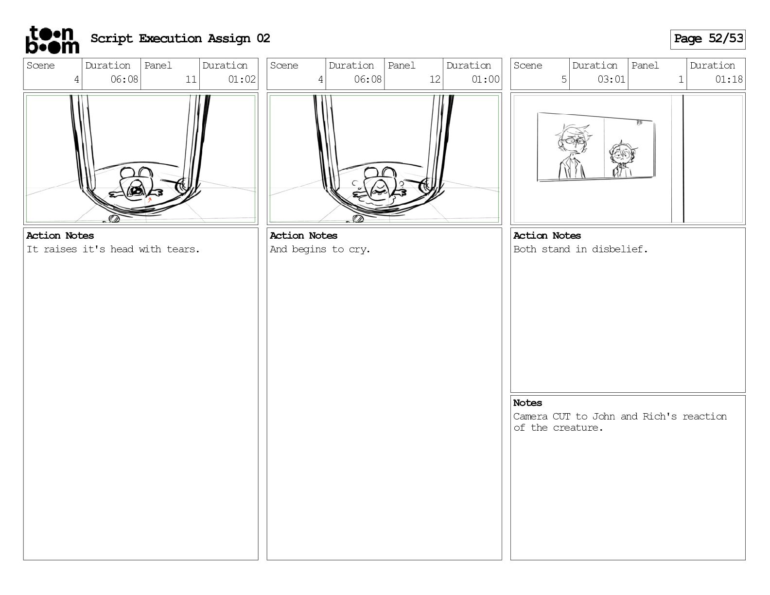 stills. Scene 3 Duration 04:01 Panel 9 Duration 01:02 Action Notes Both turn to face the machine. Scene 4 Duration 06:08 Panel 1 Duration 00:20 Action Notes The entity emerges from the dark. Notes Camera CUT to close up on entity, and PANS up to view it. Script Execution Assign 02 Page 46/53