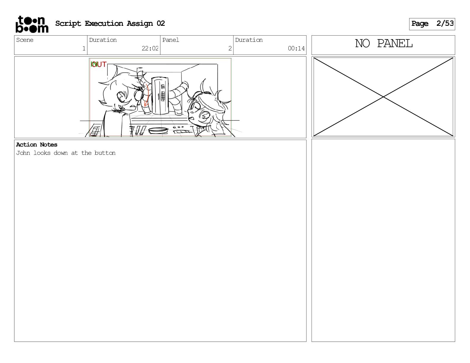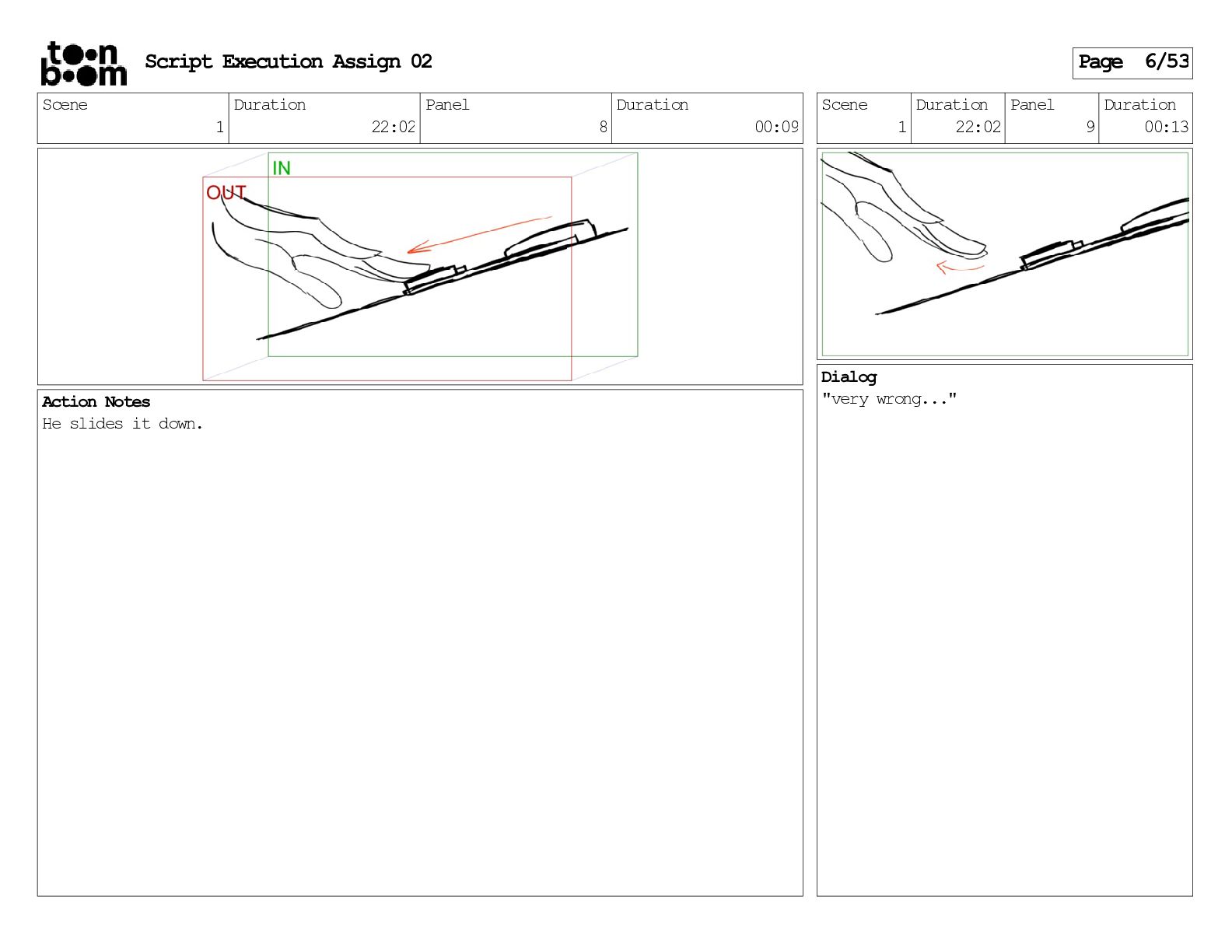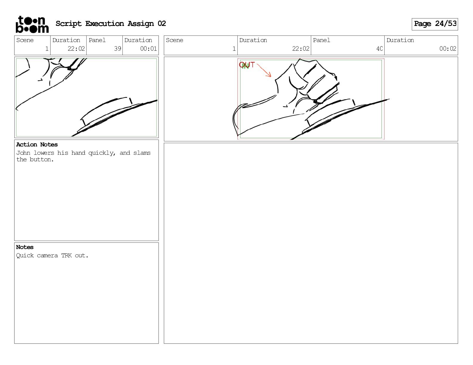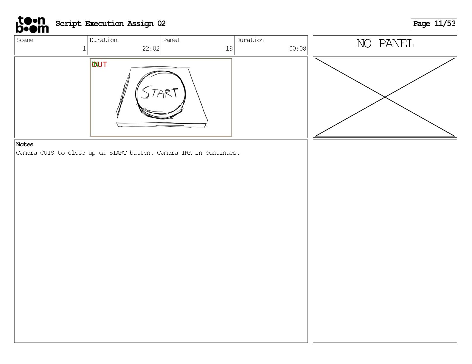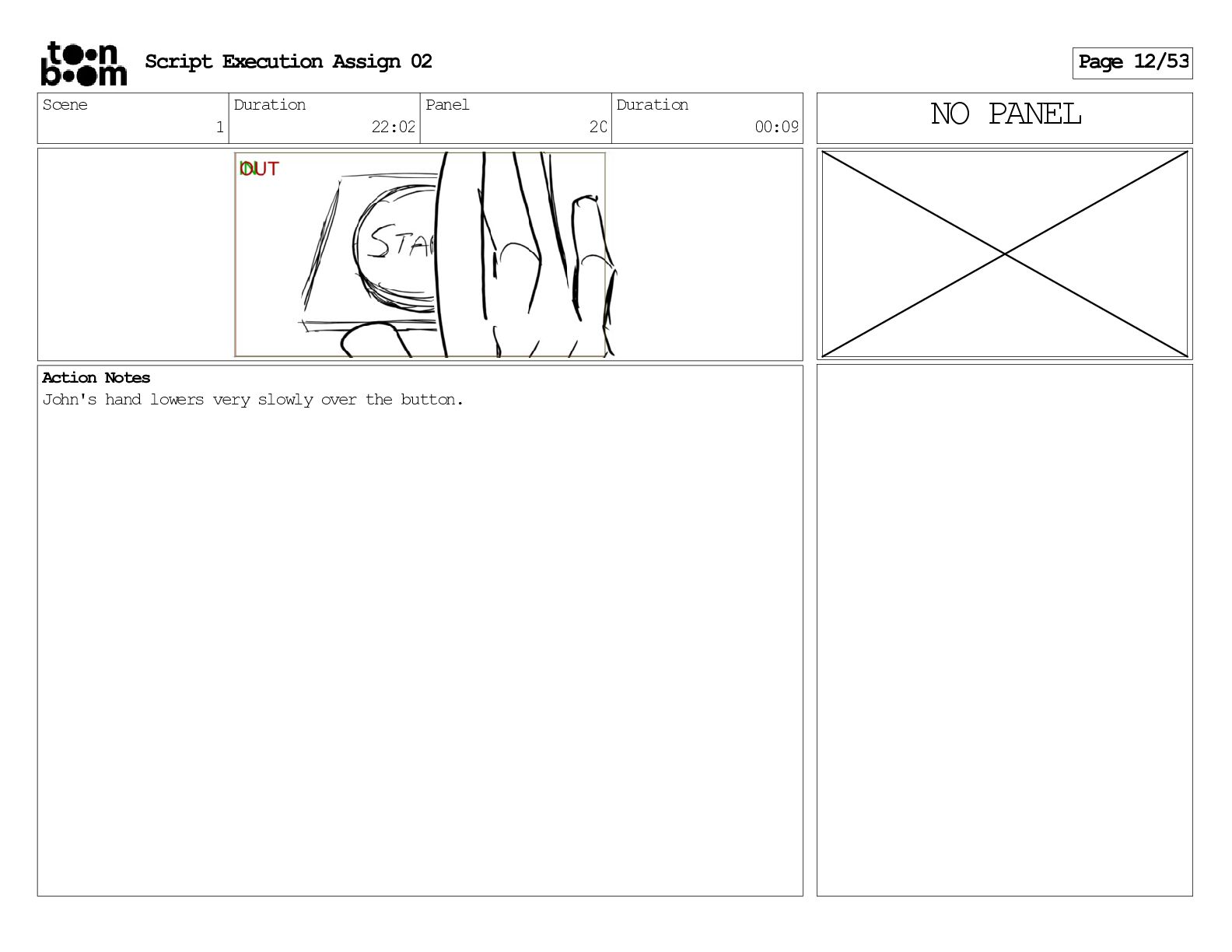 stills. Scene 3 Duration 04:01 Panel 9 Duration 01:02 Action Notes Both turn to face the machine. Scene 4 Duration 06:08 Panel 1 Duration 00:20 Action Notes The entity emerges from the dark. Notes Camera CUT to close up on entity, and PANS up to view it. Script Execution Assign 02 Page 46/53