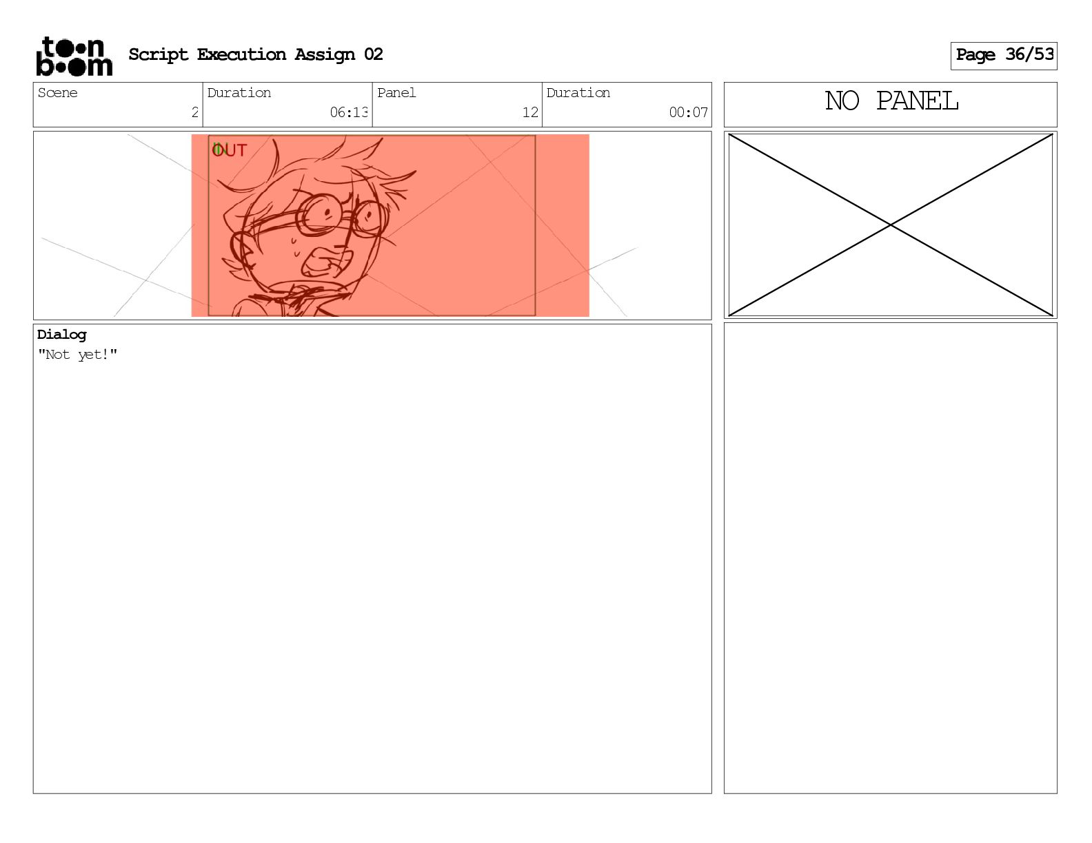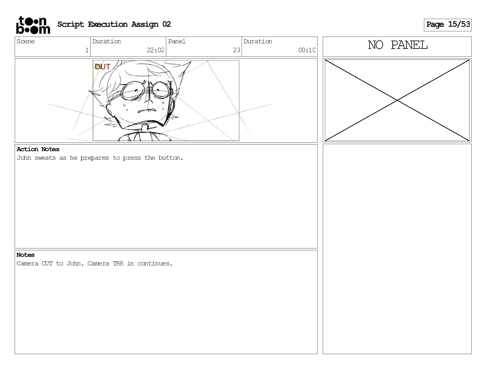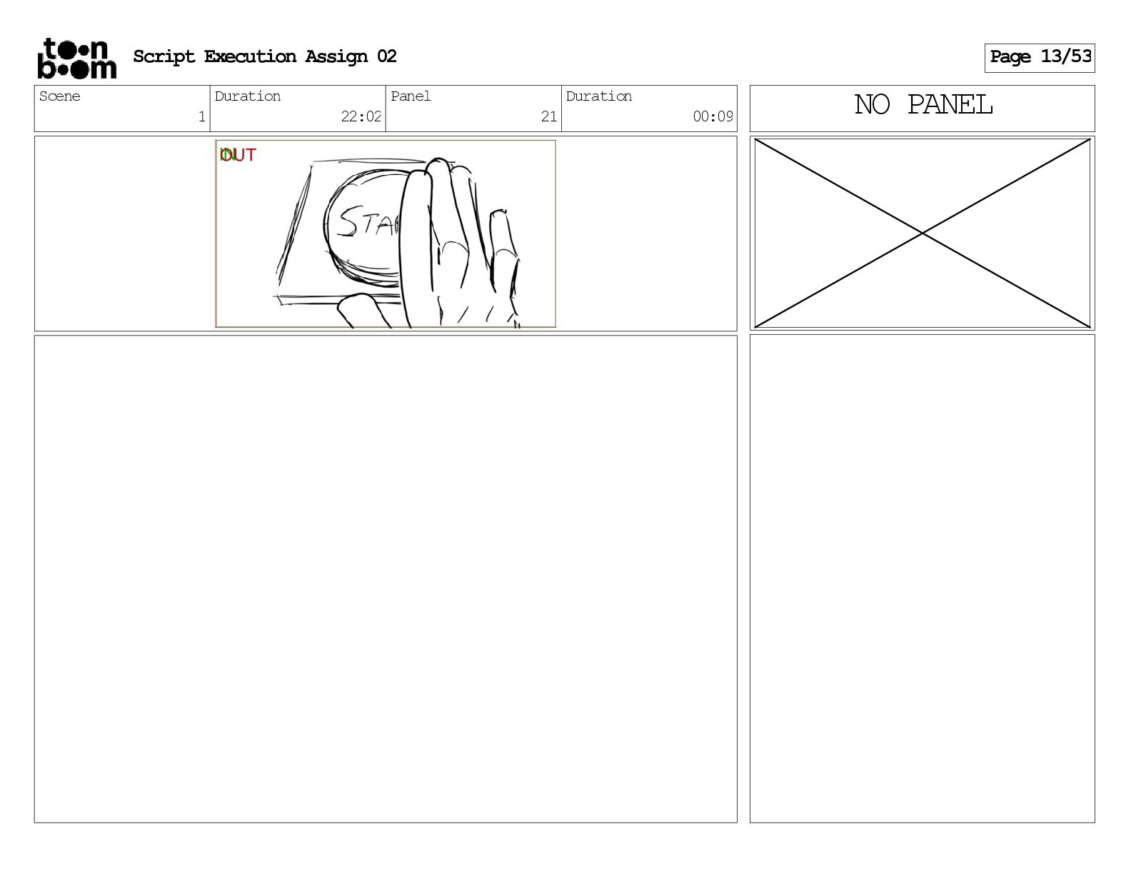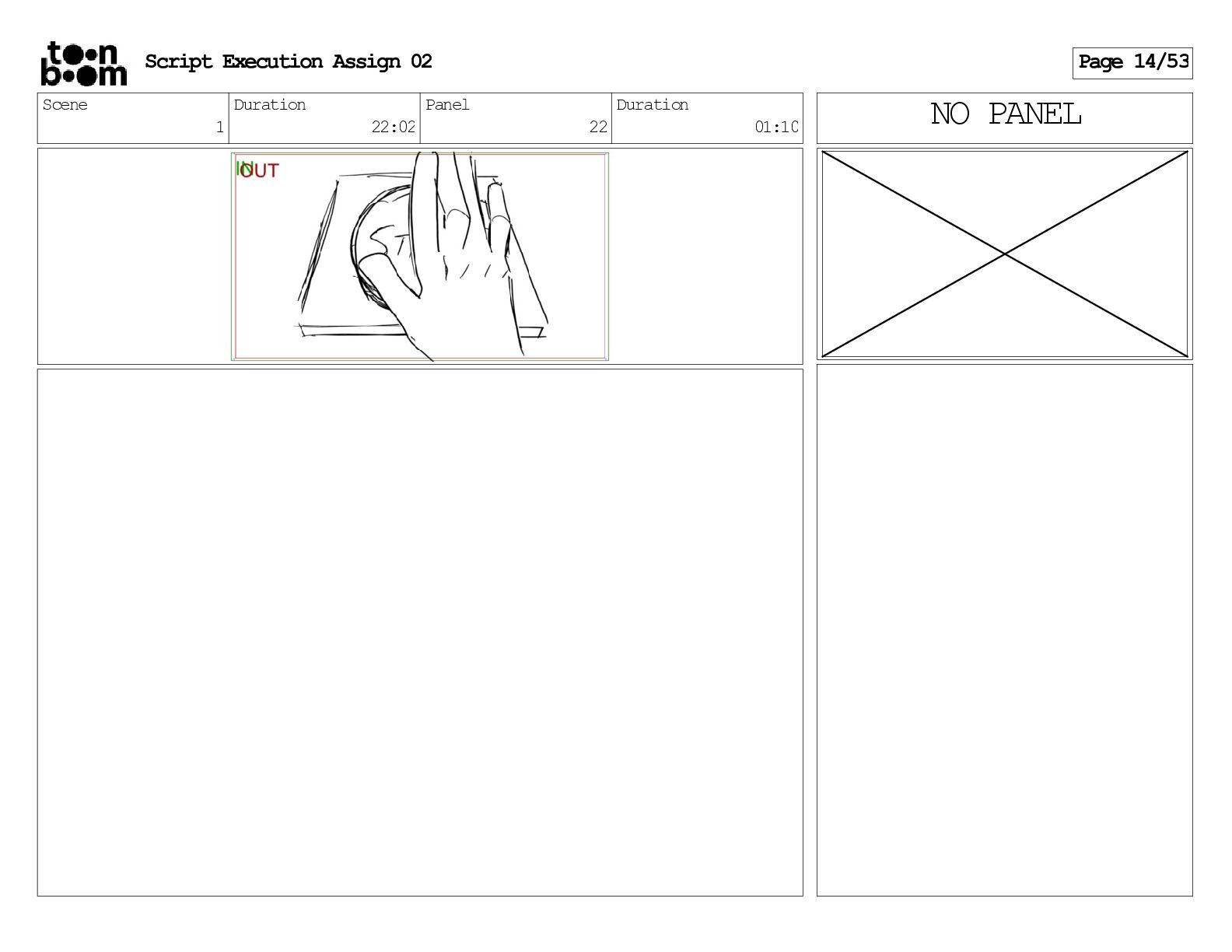 stills. Scene 3 Duration 04:01 Panel 9 Duration 01:02 Action Notes Both turn to face the machine. Scene 4 Duration 06:08 Panel 1 Duration 00:20 Action Notes The entity emerges from the dark. Notes Camera CUT to close up on entity, and PANS up to view it. Script Execution Assign 02 Page 46/53