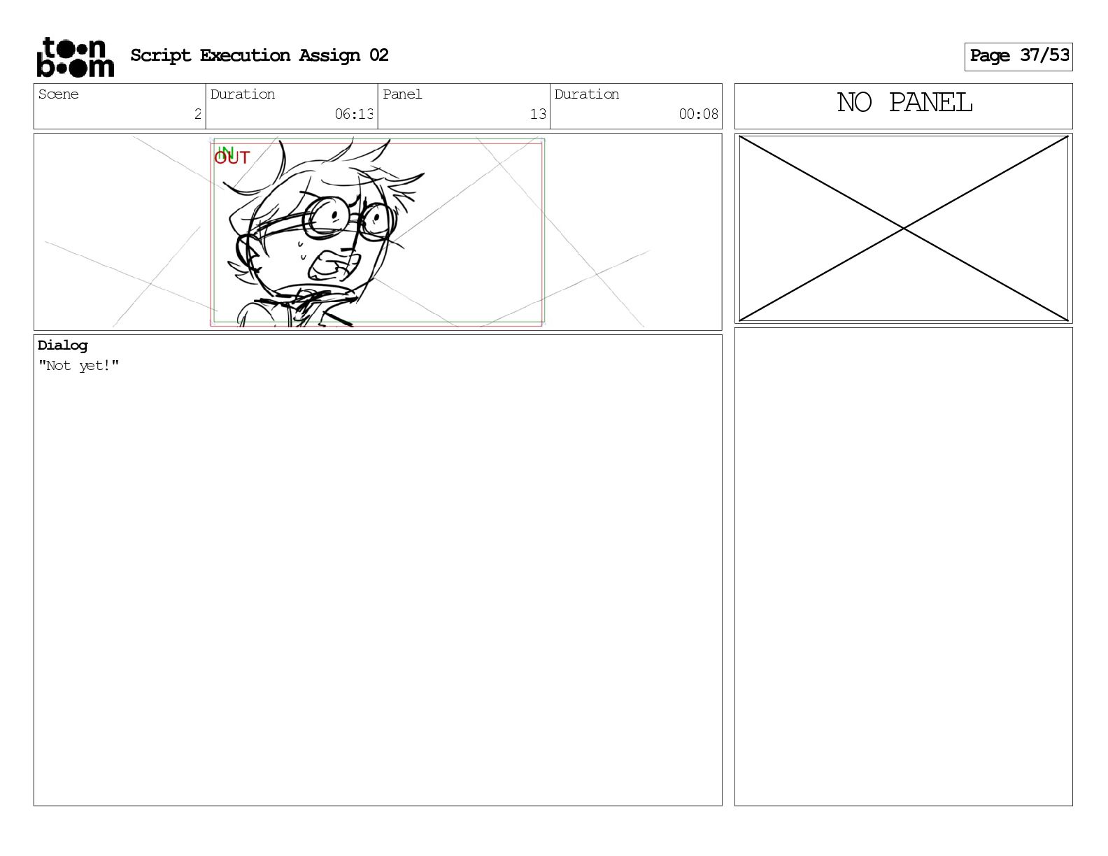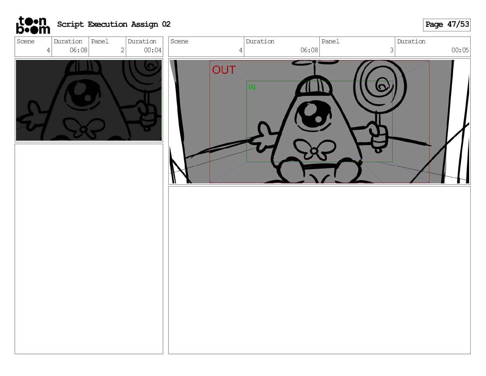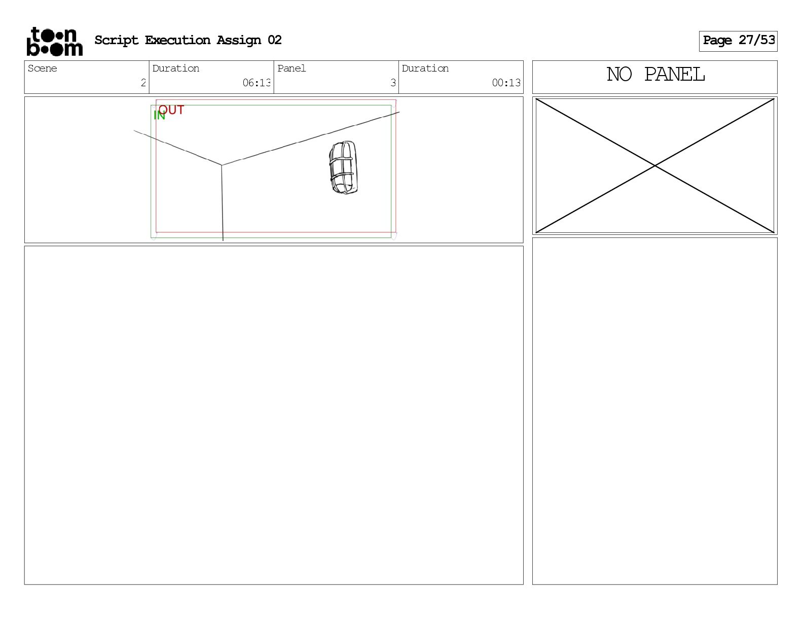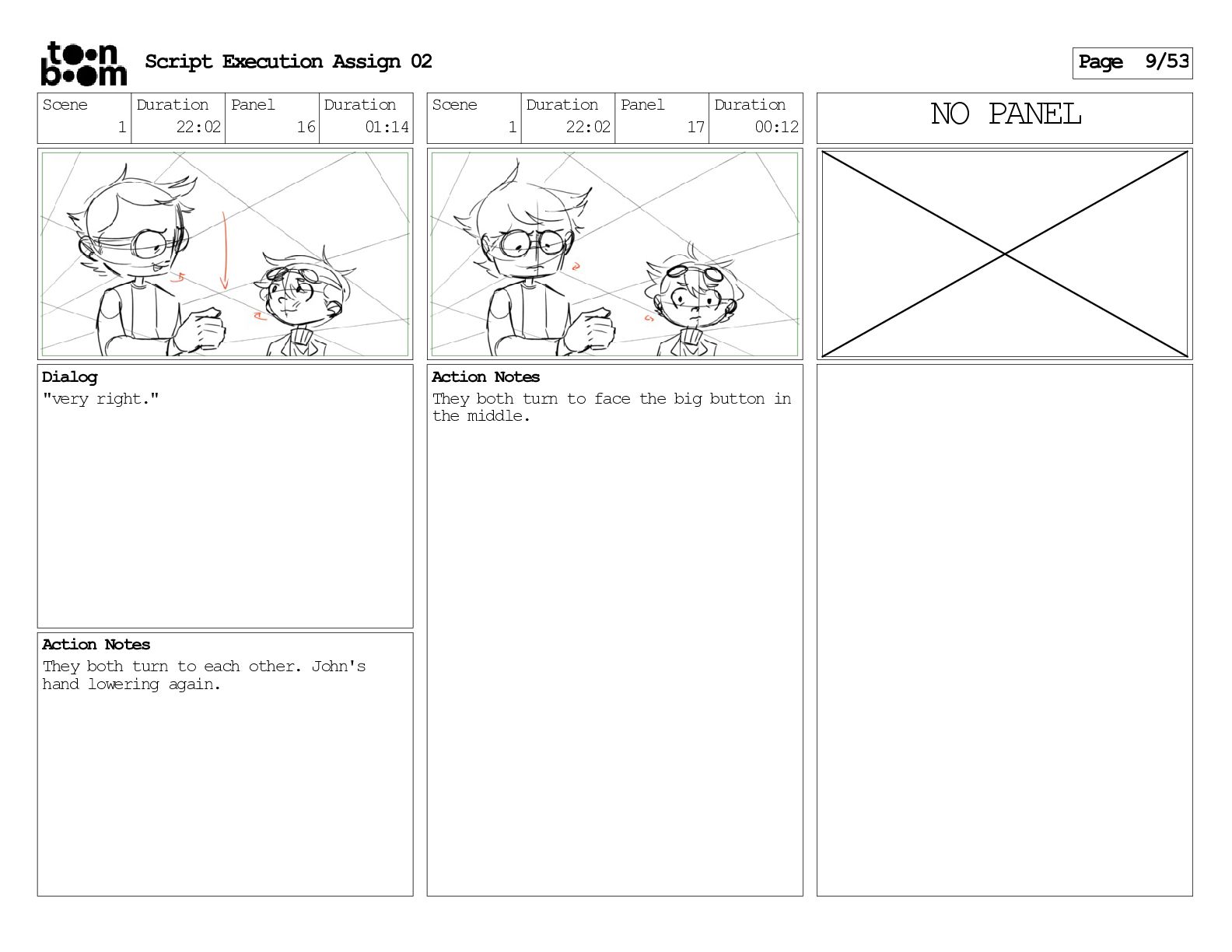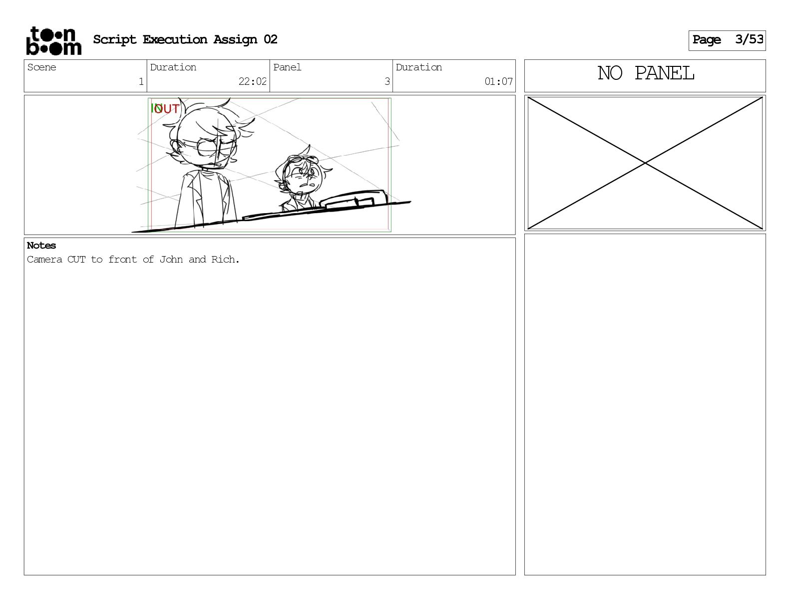 stills. Scene 3 Duration 04:01 Panel 9 Duration 01:02 Action Notes Both turn to face the machine. Scene 4 Duration 06:08 Panel 1 Duration 00:20 Action Notes The entity emerges from the dark. Notes Camera CUT to close up on entity, and PANS up to view it. Script Execution Assign 02 Page 46/53