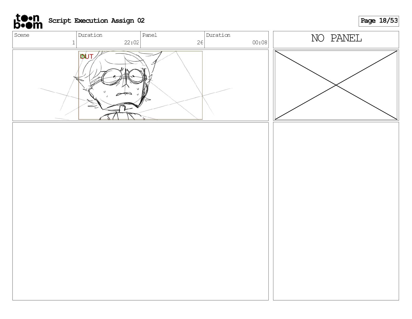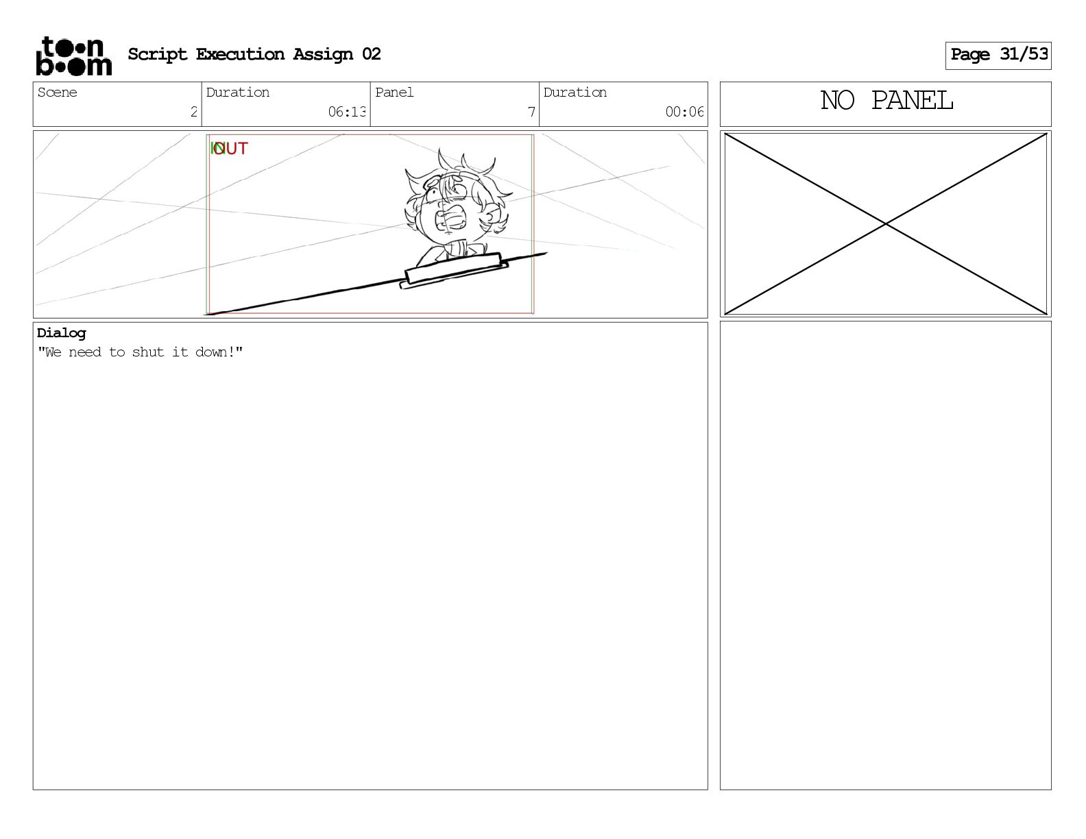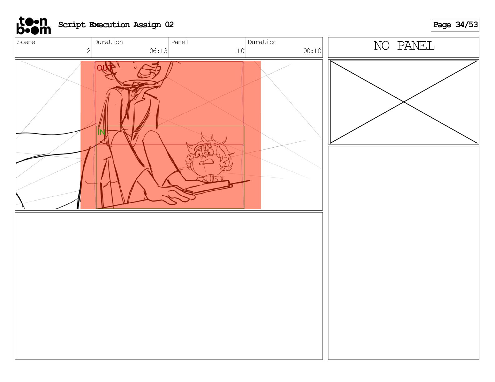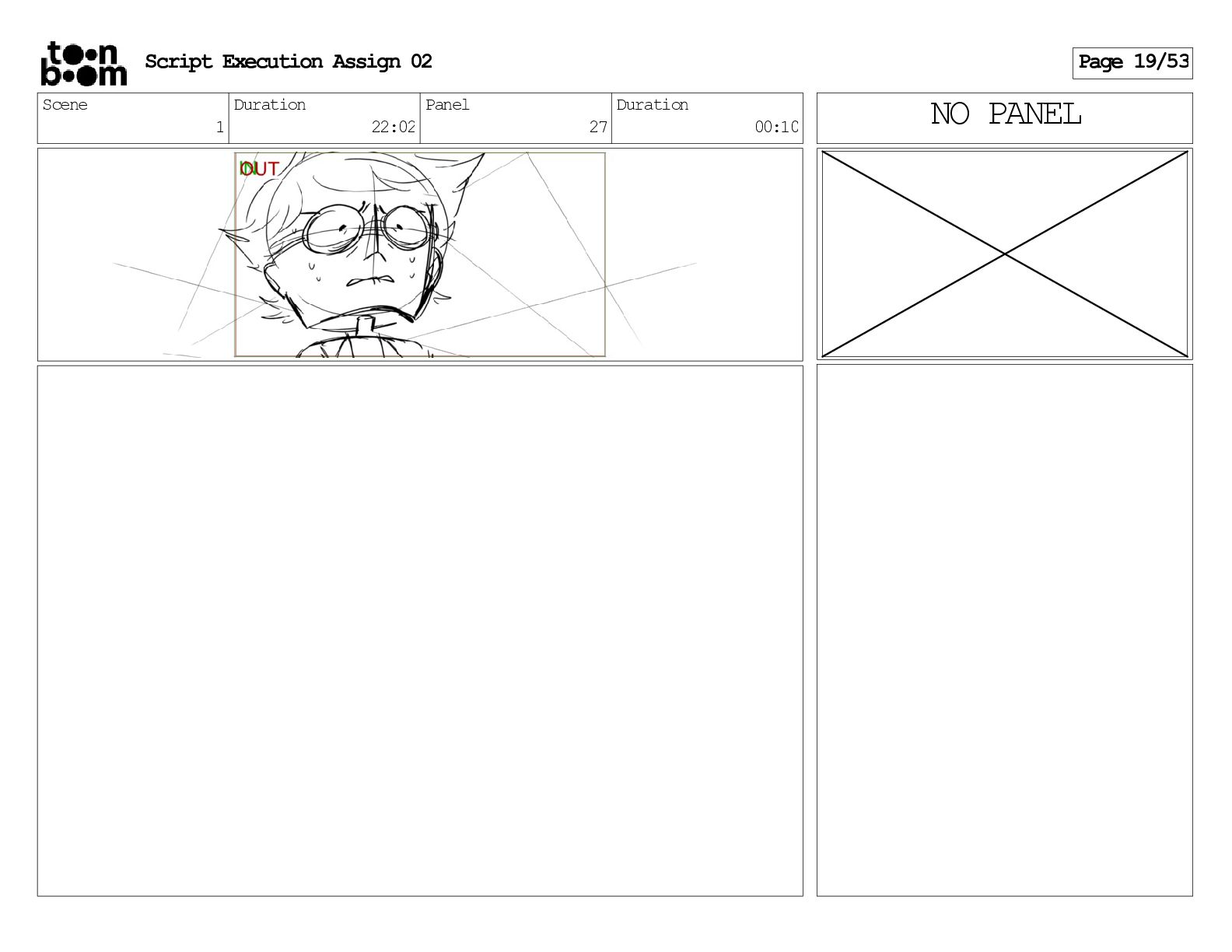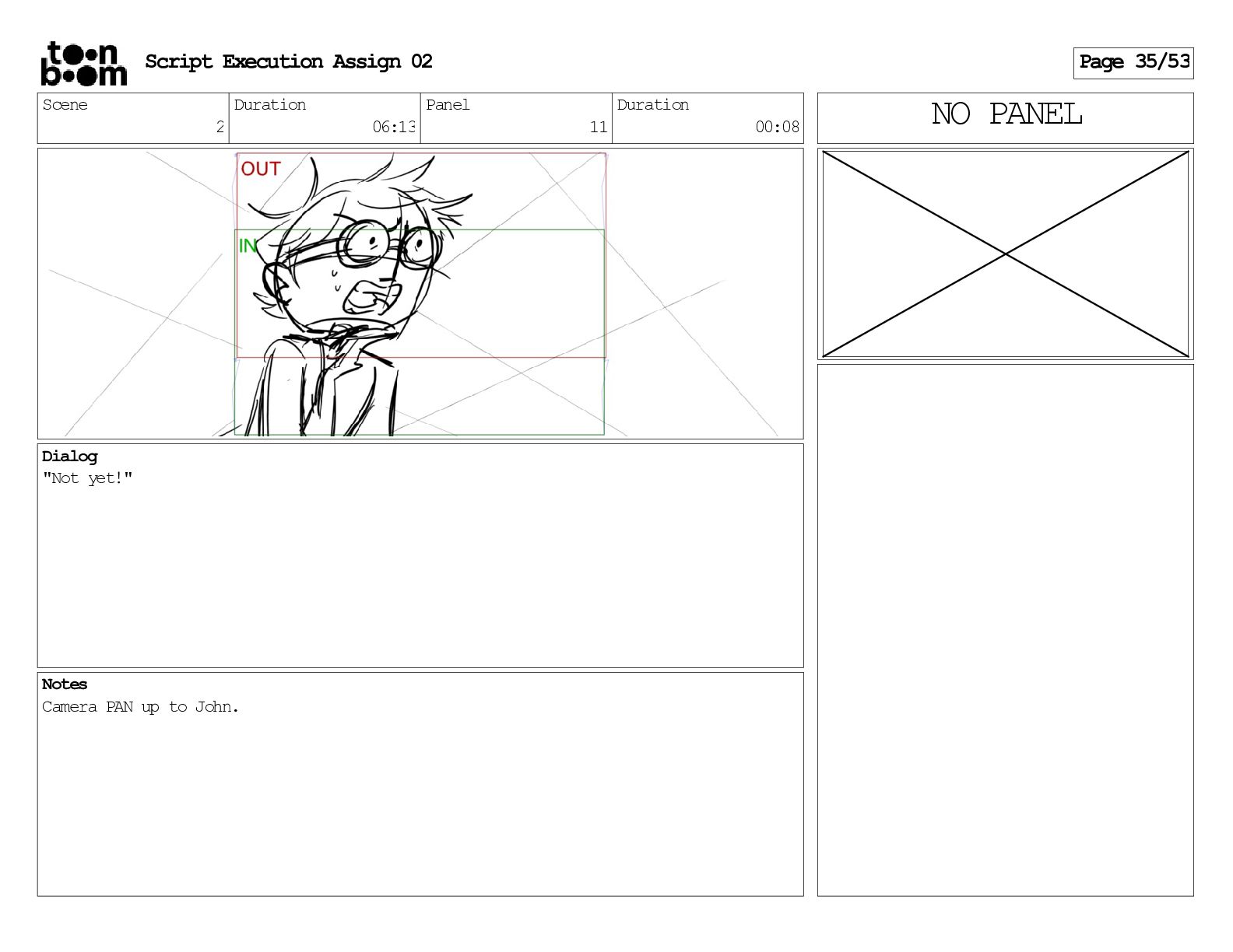 stills. Scene 3 Duration 04:01 Panel 9 Duration 01:02 Action Notes Both turn to face the machine. Scene 4 Duration 06:08 Panel 1 Duration 00:20 Action Notes The entity emerges from the dark. Notes Camera CUT to close up on entity, and PANS up to view it. Script Execution Assign 02 Page 46/53