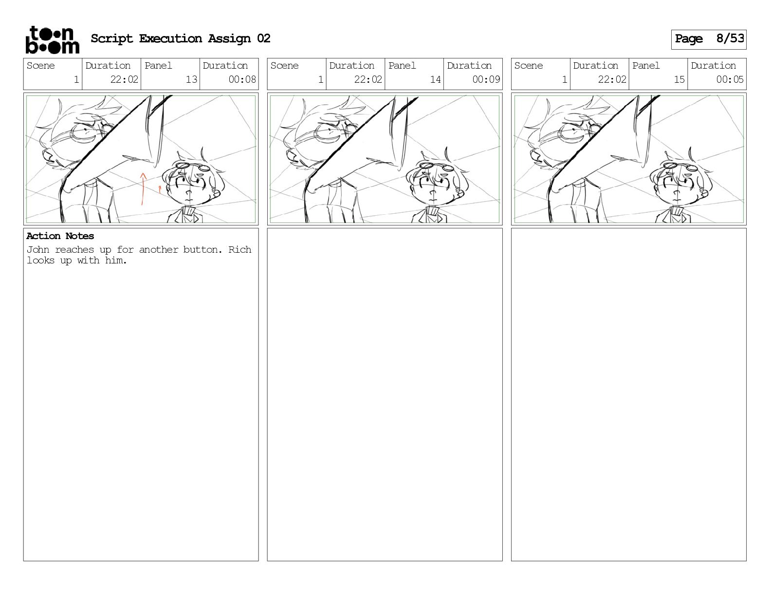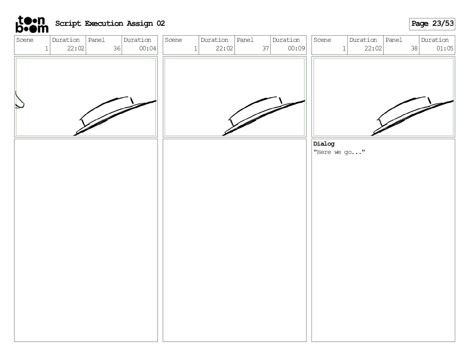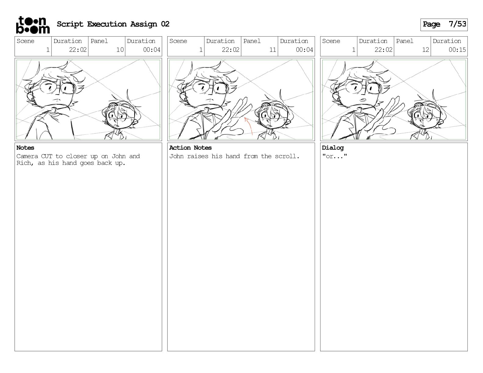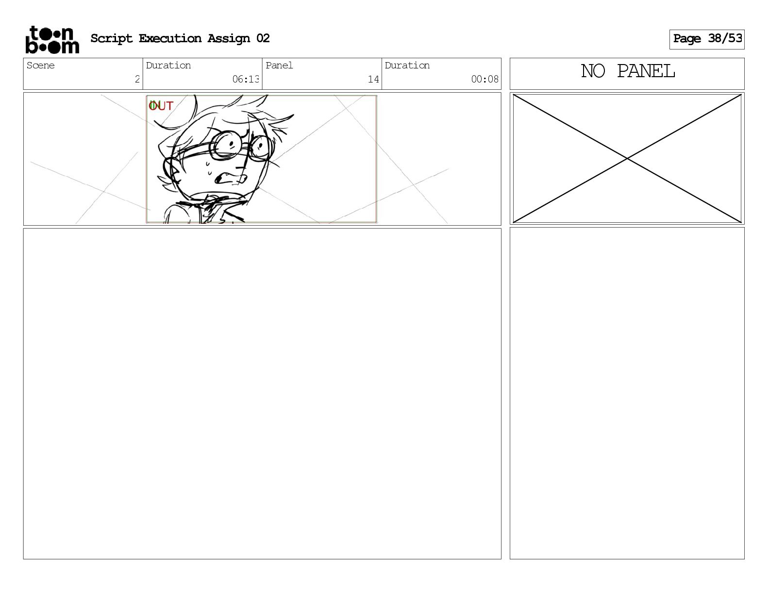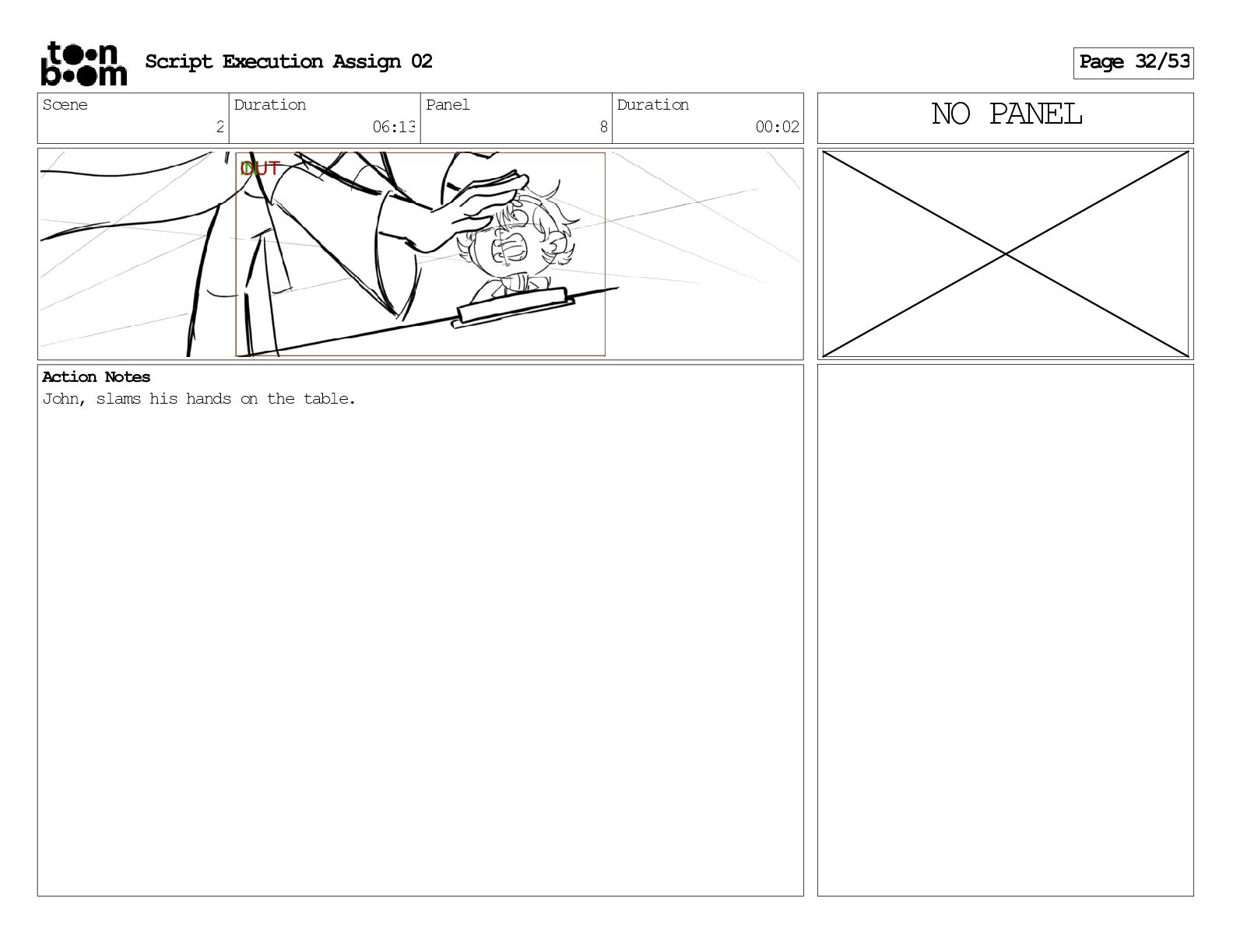 stills. Scene 3 Duration 04:01 Panel 9 Duration 01:02 Action Notes Both turn to face the machine. Scene 4 Duration 06:08 Panel 1 Duration 00:20 Action Notes The entity emerges from the dark. Notes Camera CUT to close up on entity, and PANS up to view it. Script Execution Assign 02 Page 46/53