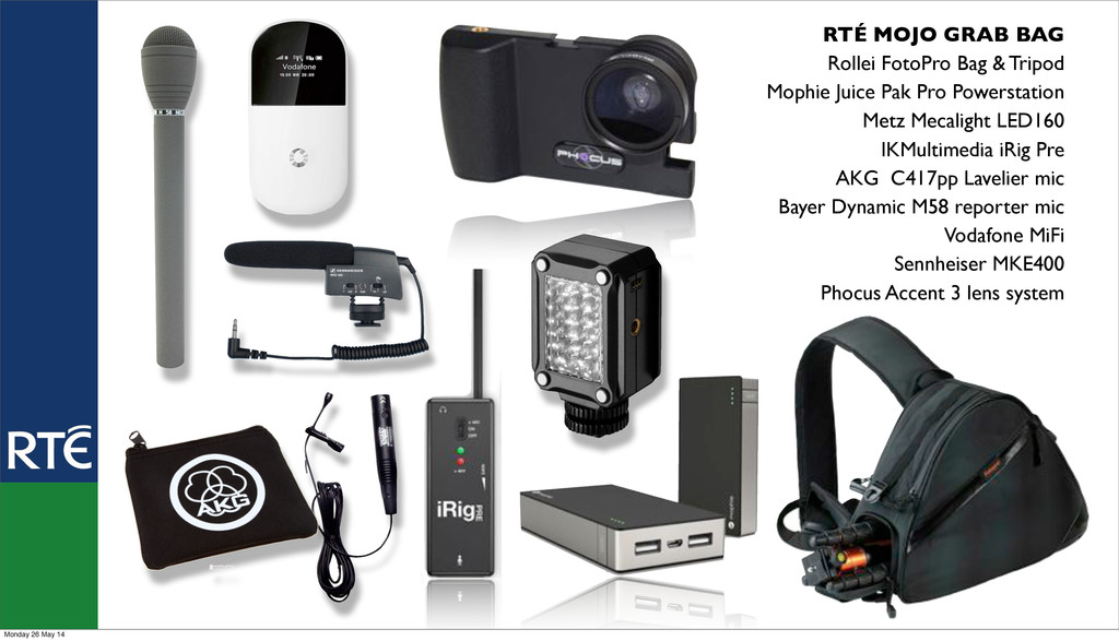 Juice Pak Pro Powerstation Metz Mecalight LED160 IKMultimedia iRig Pre AKG C417pp Lavelier mic Bayer Dynamic M58 reporter mic Vodafone MiFi Sennheiser MKE400 Phocus Accent 3 lens system Monday 26 May 14