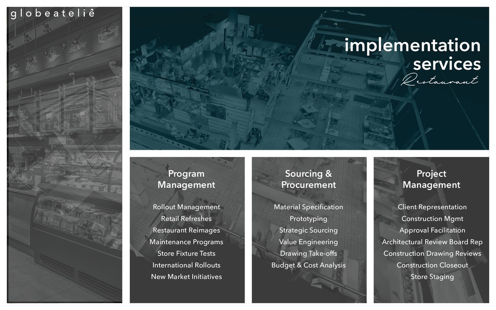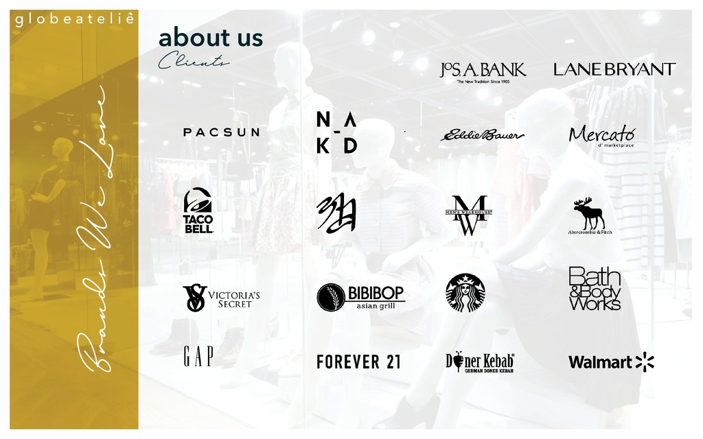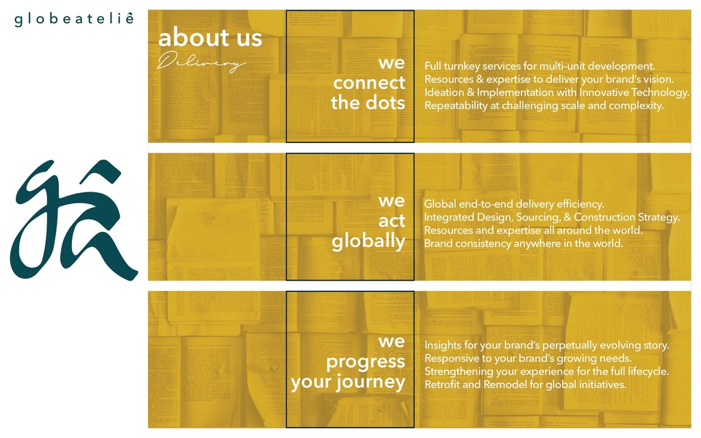 deliver your brand’s vision. Ideation & Implementation with Innovative Technology. Repeatability at challenging scale and complexity. Global end-to-end delivery effi ciency. Integrated Design, Sourcing, & Construction Strategy. Resources and expertise all around the world. Brand consistency anywhere in the world. Insights for your brand’s perpetually evolving story. Responsive to your brand’s growing needs. Strengthening your experience for the full lifecycle. Retrofi t and Remodel for global initiatives. about us we connect the dots we act globally we progress your journey Delivery