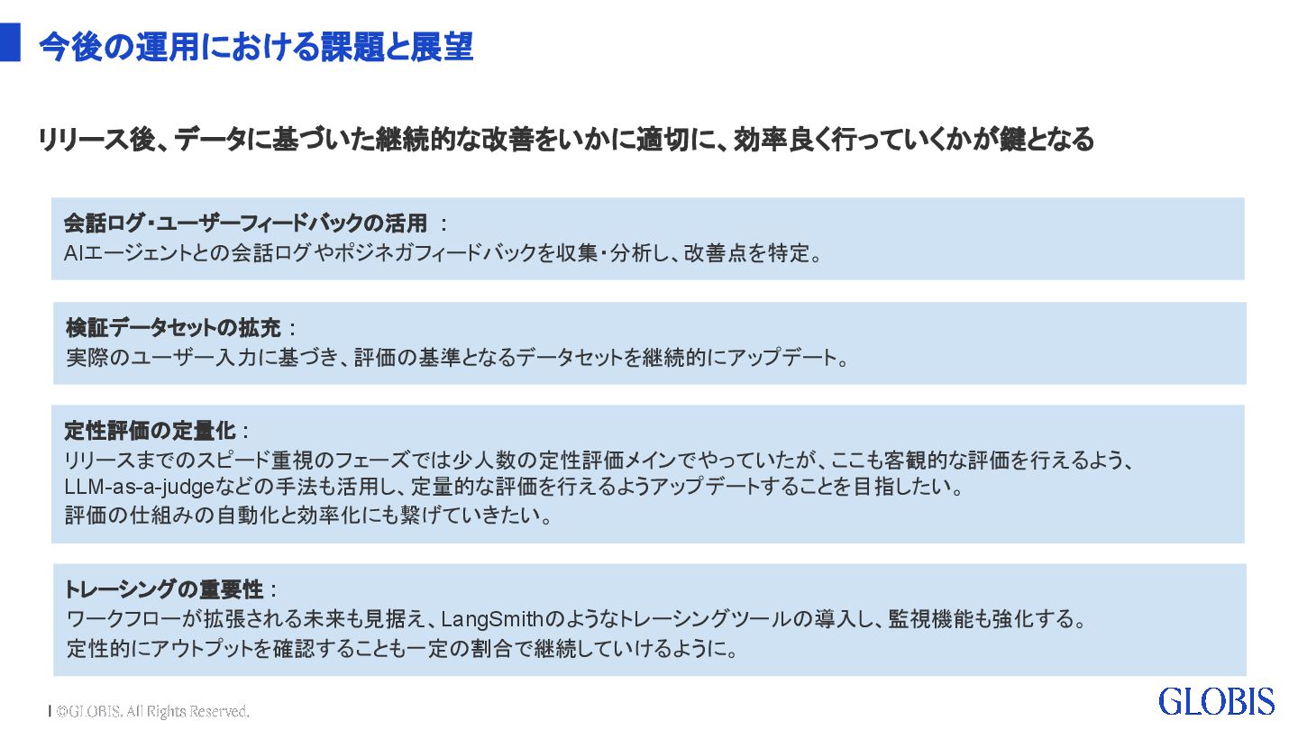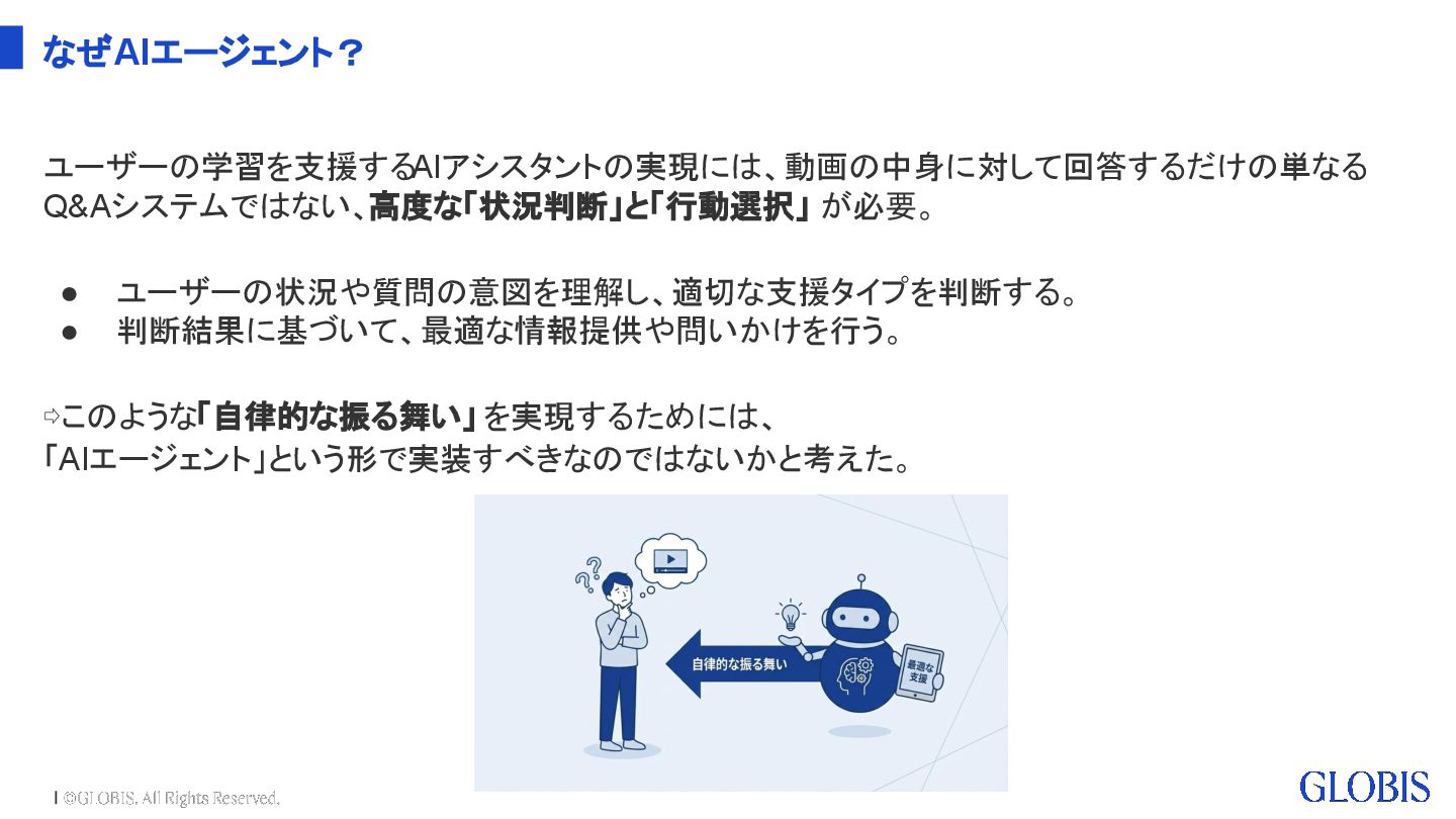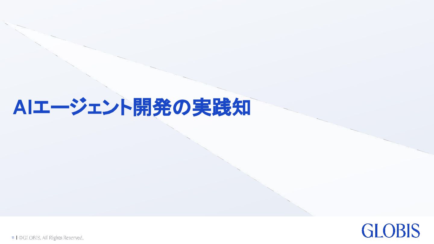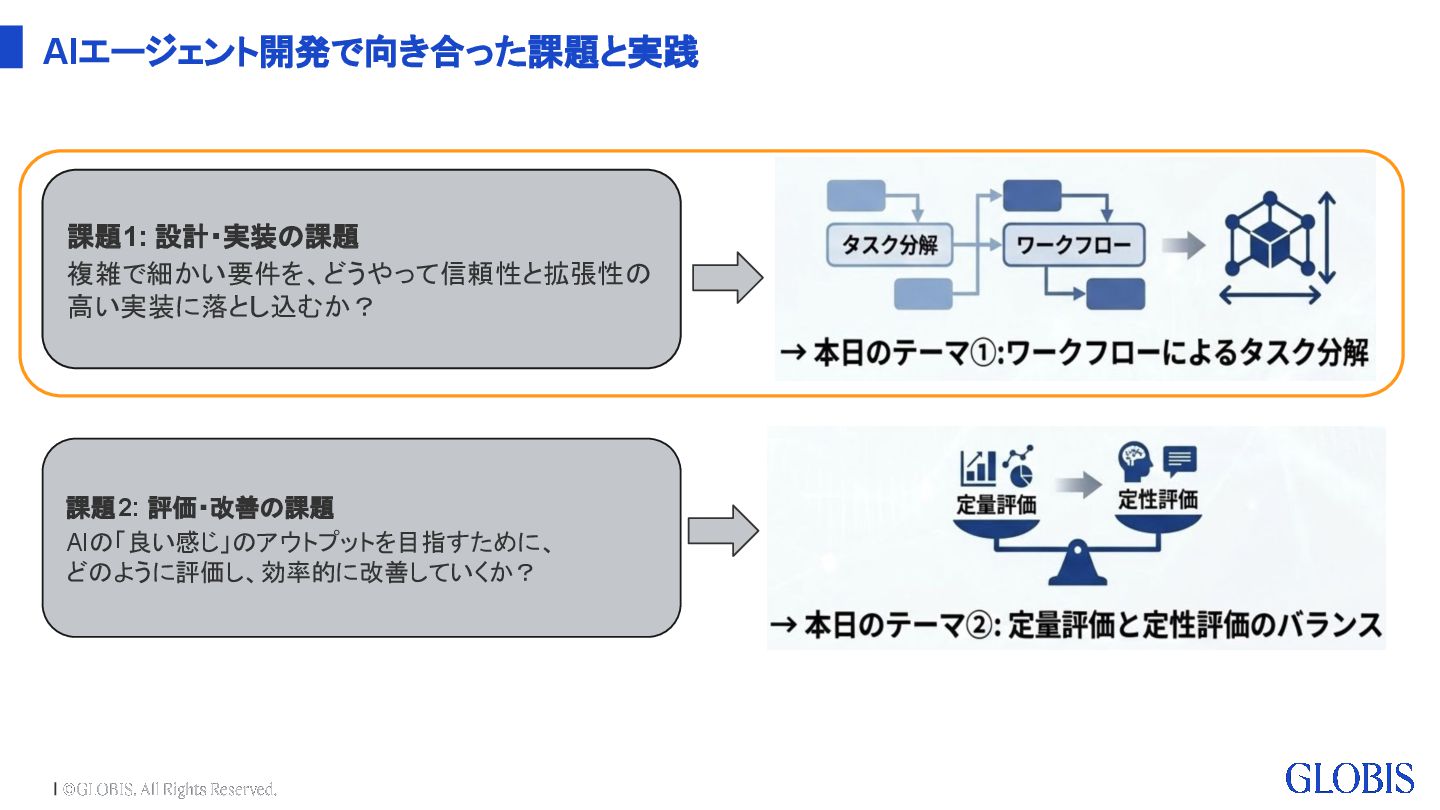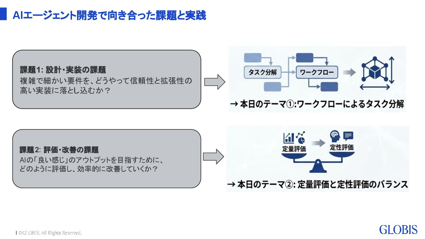 12/10(水)AIエージェント実装の壁と突破口〜プロダクト実装の実践知〜での発表内容です。 グロービスがAIエージェントを実装したうえでの難所や取り組みについて田邊がプレゼンテーションを実施しました。