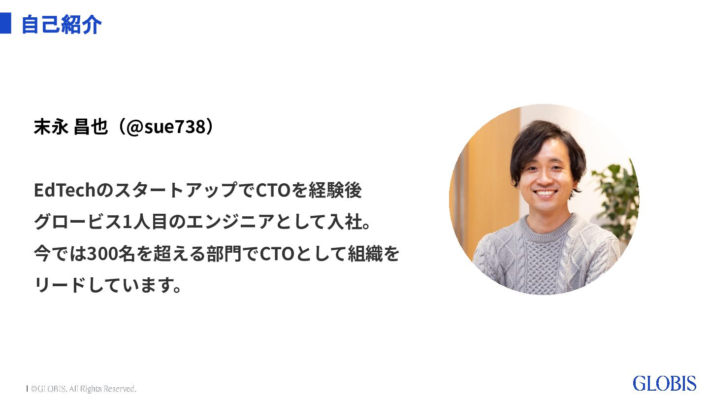 自己紹介 末永 昌也(@sue738) EdTechのスタートアップでCTOを経験後 グロービス1⼈⽬のエンジニアとして⼊社。 今では300名を超える部⾨でCTOとして組織を リードしています。