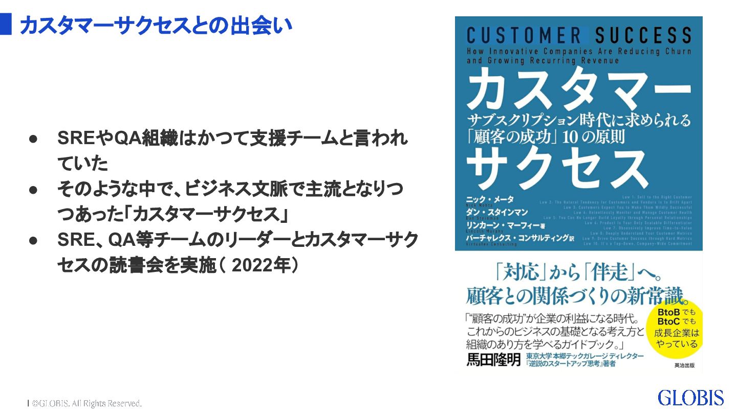 • SREやQA組織はかつて支援チームと言われ ていた • そのような中で、ビジネス文脈で主流となりつ つあった「カスタマーサクセス」 • SRE、QA等チームのリーダーとカスタマーサク セスの読書会を実施( 2022年)