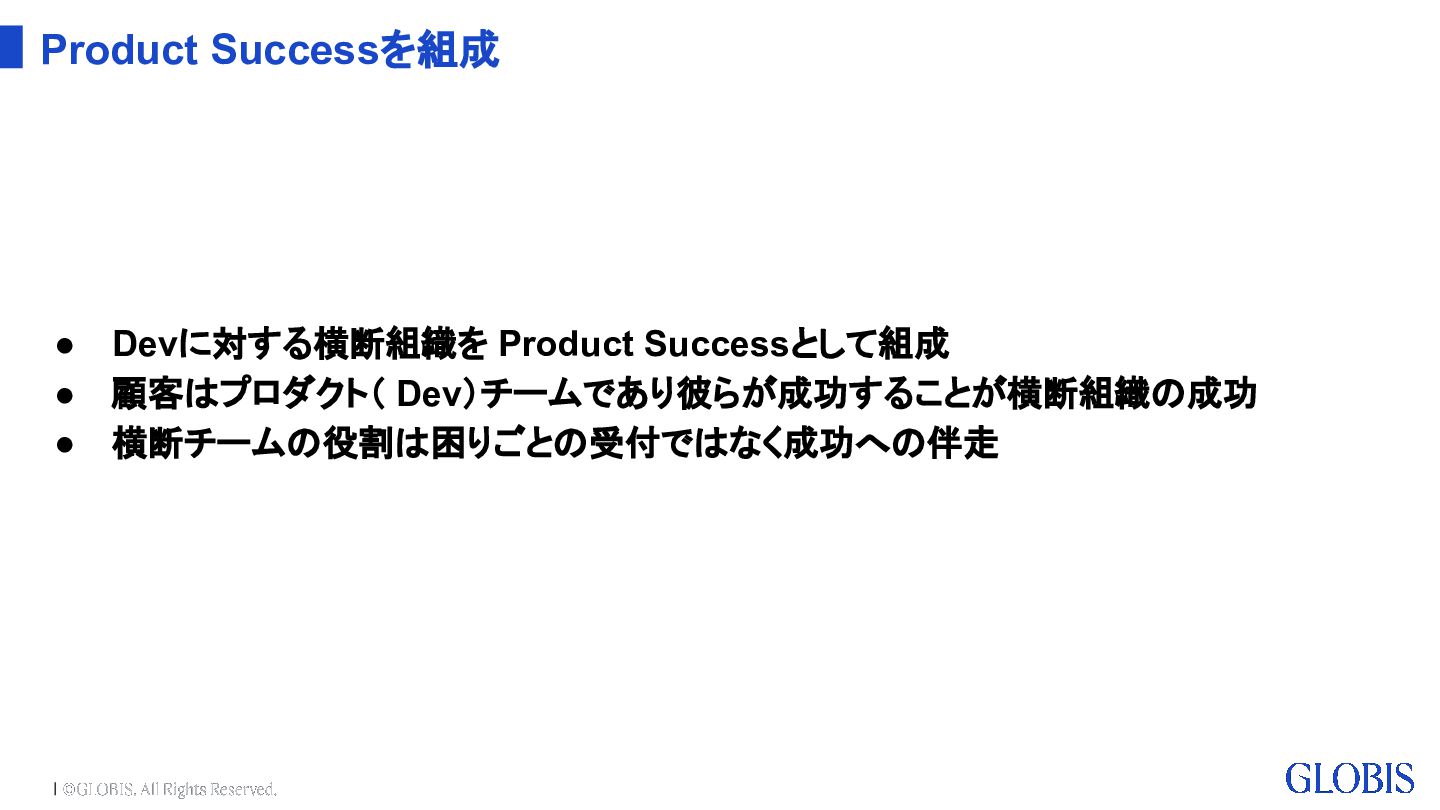 • Devに対する横断組織を Product Successとして組成 • 顧客はプロダクト( Dev)チームであり彼らが成功することが横断組織の成功 • 横断チームの役割は困りごとの受付ではなく成功への伴走 Product
