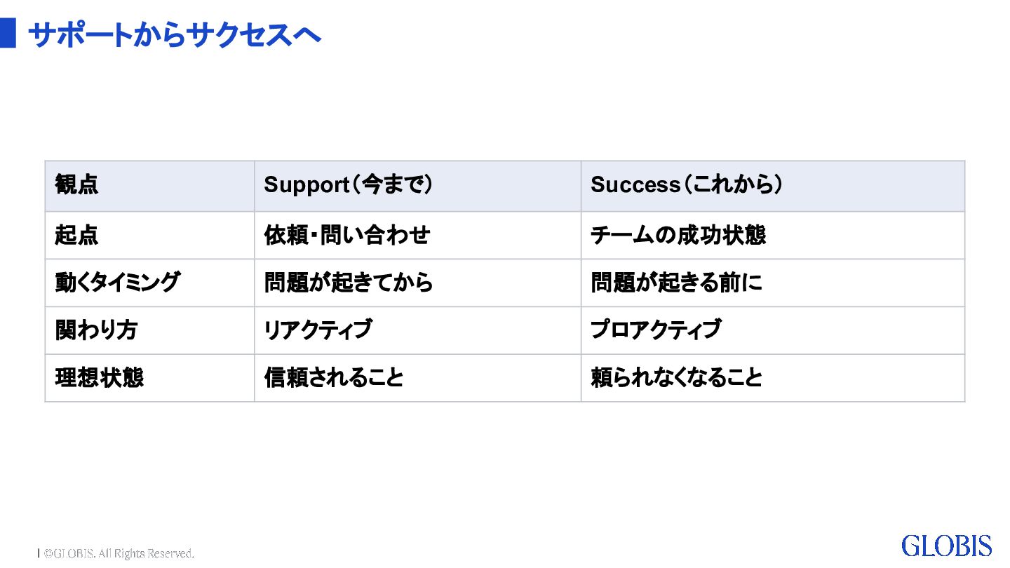 サポートからサクセスへ 観点 Support(今まで) Success(これから) 起点 依頼・問い合わせ チームの成功状態 動くタイミング 問題が起きてから 問題が起きる前に