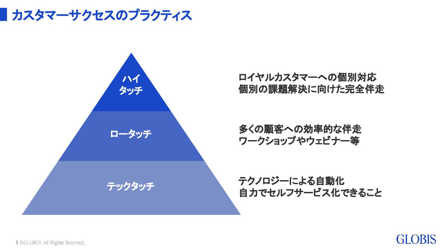 カスタマーサクセスのプラクティス テックタッチ ロータッチ ハイ タッチ ロイヤルカスタマーへの個別対応 個別の課題解決に向けた完全伴走 多くの顧客への効率的な伴走 ワークショップやウェビナー等 テクノロジーによる自動化