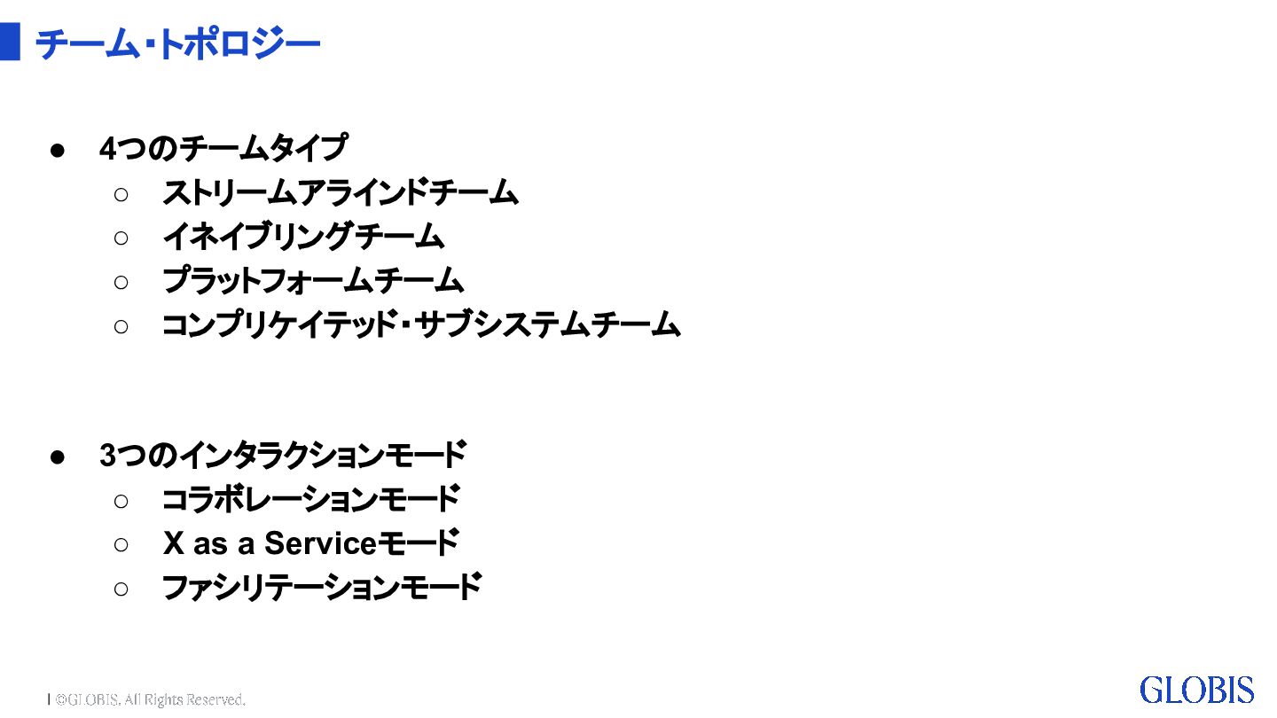 チーム・トポロジー • 4つのチームタイプ ◦ ストリームアラインドチーム ◦ イネイブリングチーム ◦ プラットフォームチーム ◦