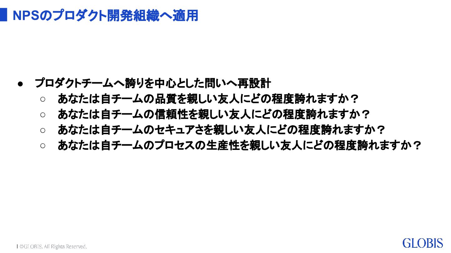 NPSのプロダクト開発組織へ適用 • プロダクトチームへ誇りを中心とした問いへ再設計 ◦ あなたは自チームの品質を親しい友人にどの程度誇れますか? ◦ あなたは自チームの信頼性を親しい友人にどの程度誇れますか? ◦ あなたは自チームのセキュアさを親しい友人にどの程度誇れますか? ◦