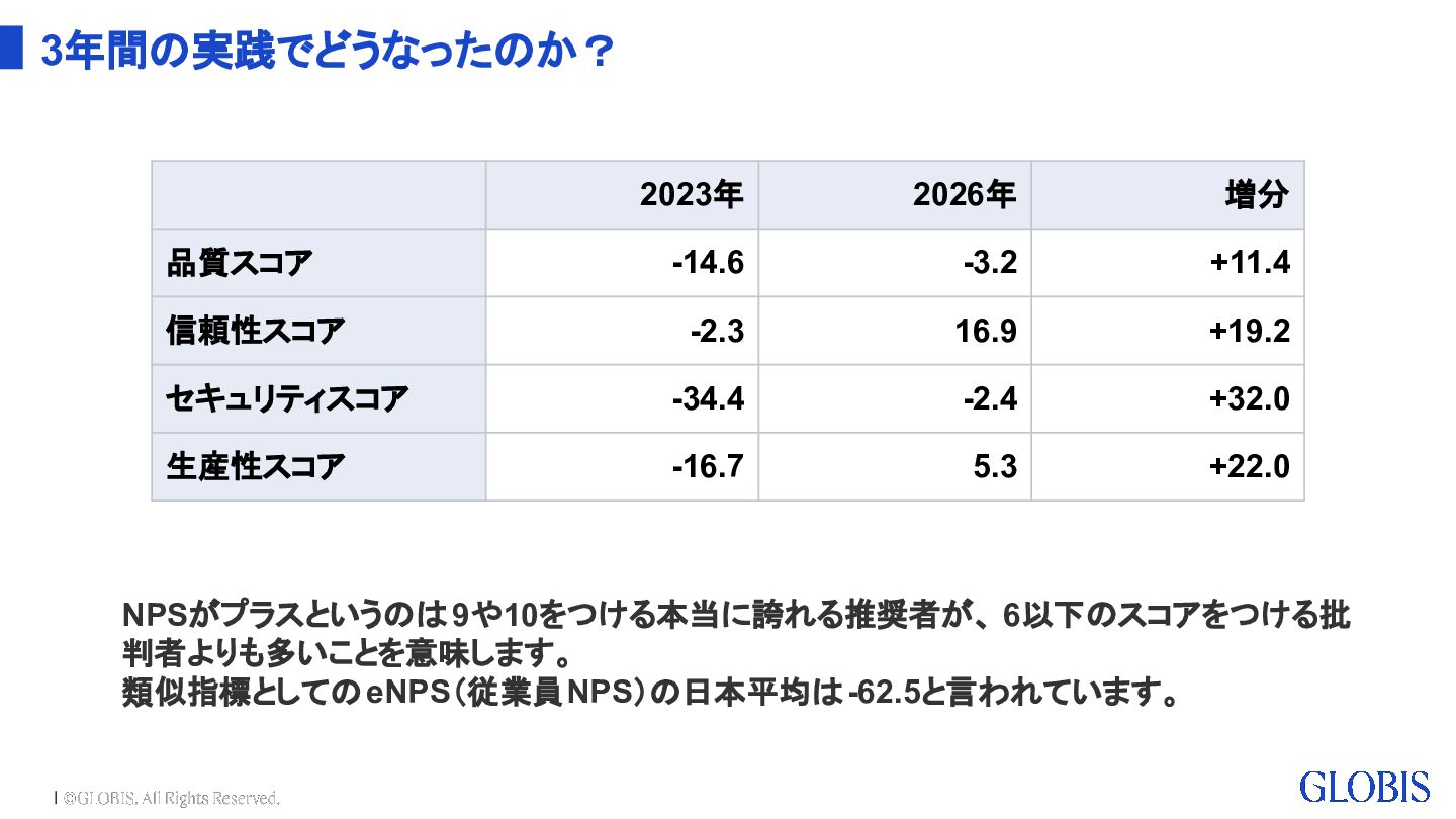 3年間の実践でどうなったのか? 2023年 2026年 増分 品質スコア -14.6 -3.2 +11.4 信頼性スコア -2.3