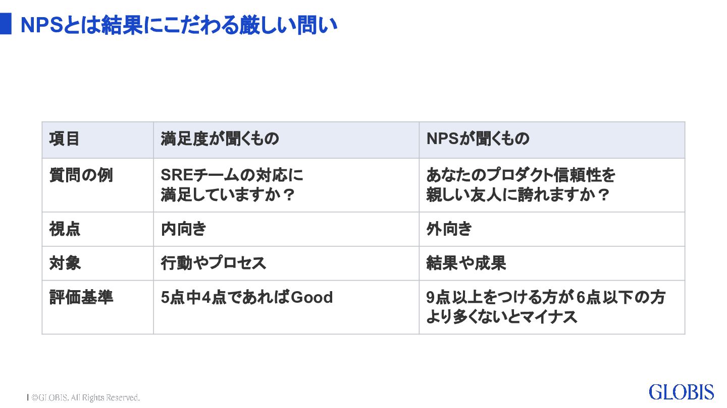 NPSとは結果にこだわる厳しい問い 項目 満足度が聞くもの NPSが聞くもの 質問の例 SREチームの対応に 満足していますか? あなたのプロダクト信頼性を 親しい友人に誇れますか? 視点