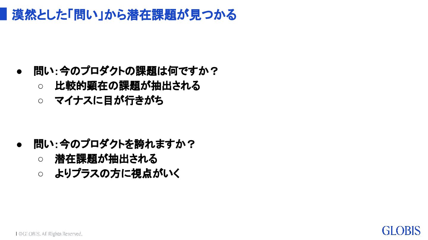 漠然とした「問い」から潜在課題が見つかる • 問い:今のプロダクトの課題は何ですか? ◦ 比較的顕在の課題が抽出される ◦ マイナスに目が行きがち • 問い:今のプロダクトを誇れますか? ◦