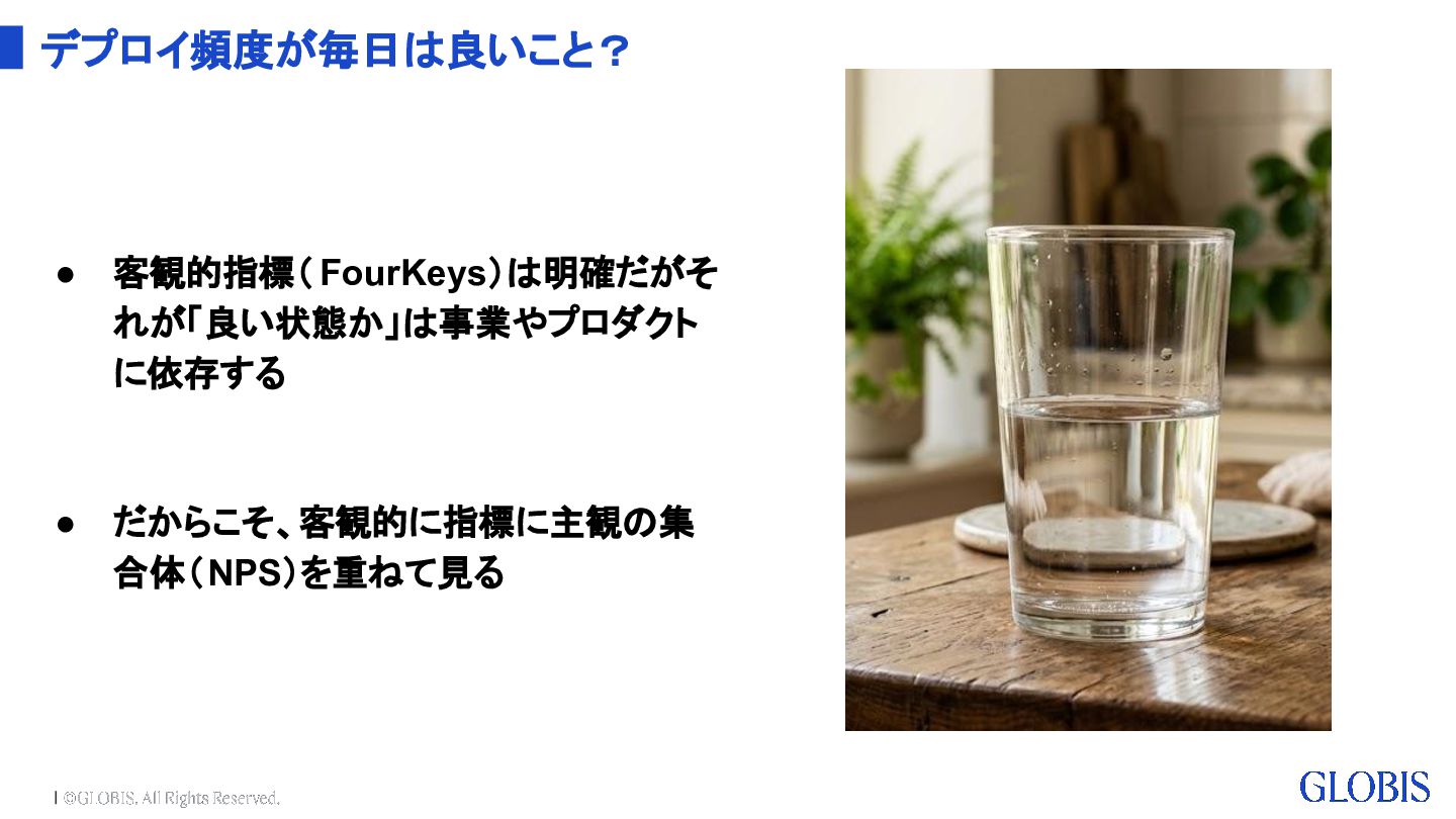 デプロイ頻度が毎日は良いこと? • 客観的指標( FourKeys)は明確だがそ れが「良い状態か」は事業やプロダクト に依存する • だからこそ、客観的に指標に主観の集 合体(NPS)を重ねて見る