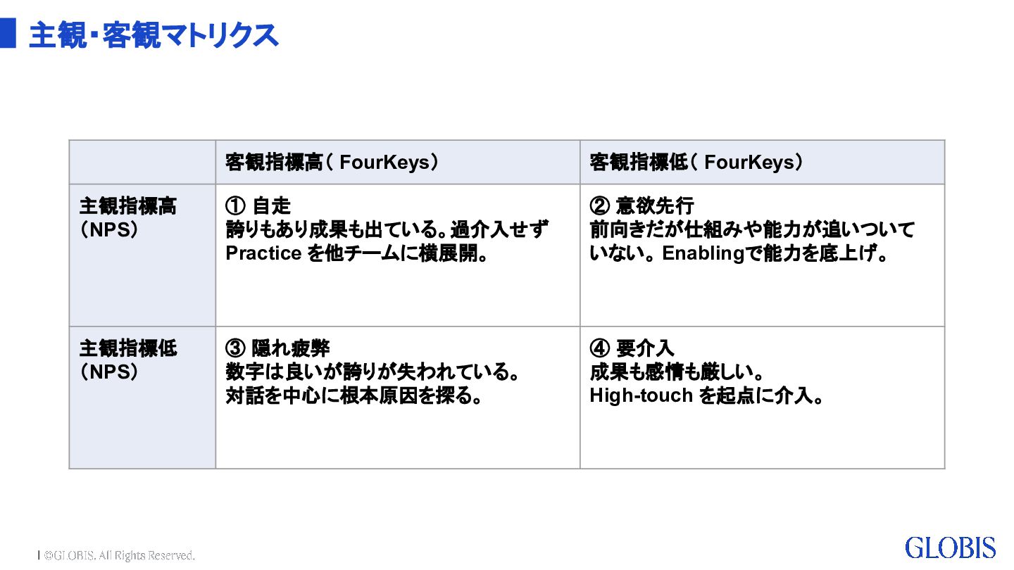 主観・客観マトリクス 客観指標高( FourKeys) 客観指標低( FourKeys) 主観指標高 (NPS) ① 自走 誇りもあり成果も出ている。過介入せず