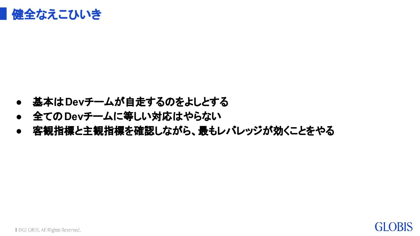 健全なえこひいき • 基本はDevチームが自走するのをよしとする • 全てのDevチームに等しい対応はやらない • 客観指標と主観指標を確認しながら、最もレバレッジが効くことをやる