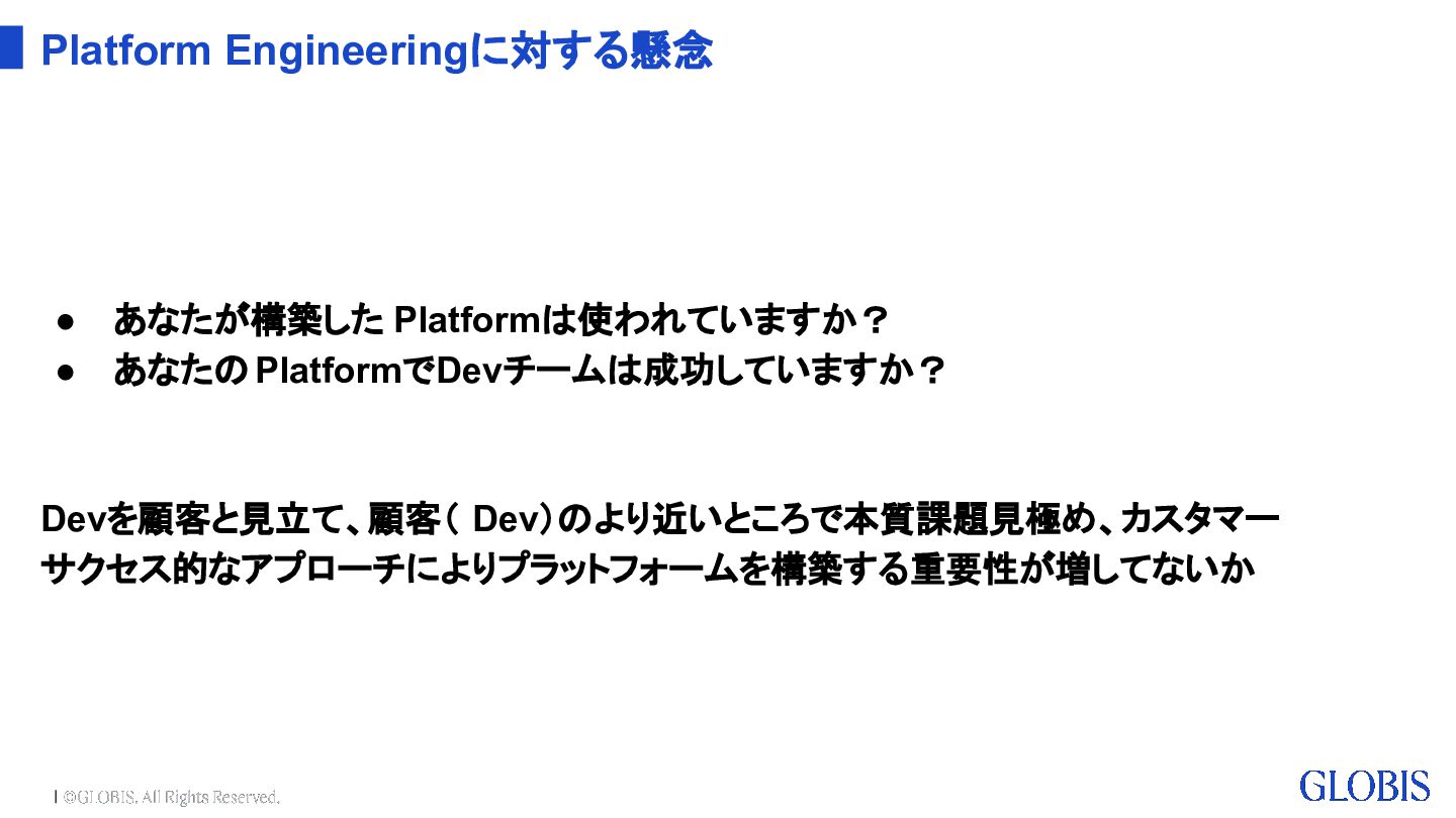 Platform Engineeringに対する懸念 • あなたが構築した Platformは使われていますか? • あなたのPlatformでDevチームは成功していますか? Devを顧客と見立て、顧客( Dev)のより近いところで本質課題見極め、カスタマー サクセス的なアプローチによりプラットフォームを構築する重要性が増してないか