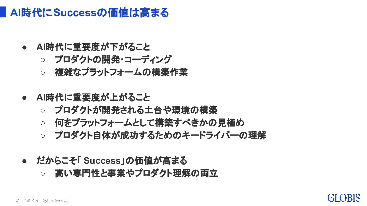 AI時代にSuccessの価値は高まる • AI時代に重要度が下がること ◦ プロダクトの開発・コーディング ◦ 複雑なプラットフォームの構築作業 • AI時代に重要度が上がること ◦