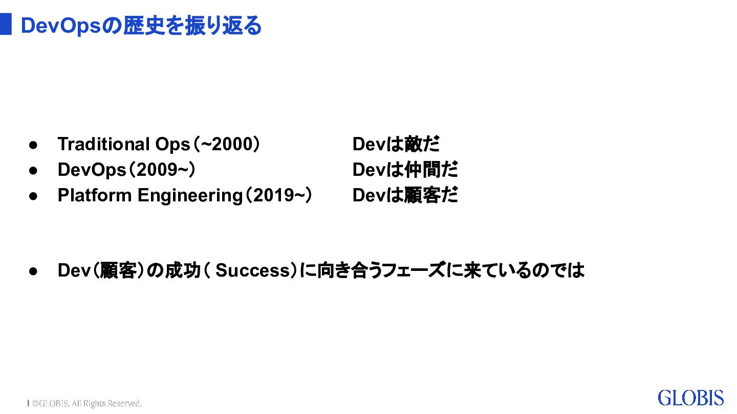 DevOpsの歴史を振り返る • Traditional Ops(~2000) Devは敵だ • DevOps(2009~) Devは仲間だ • Platform