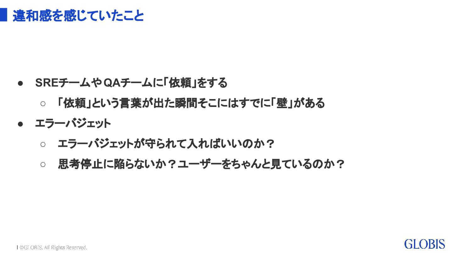 • SREチームやQAチームに「依頼」をする ◦ 「依頼」という言葉が出た瞬間そこにはすでに「壁」がある • エラーバジェット ◦ エラーバジェットが守られて入ればいいのか? ◦ 思考停止に陥らないか?ユーザーをちゃんと見ているのか?