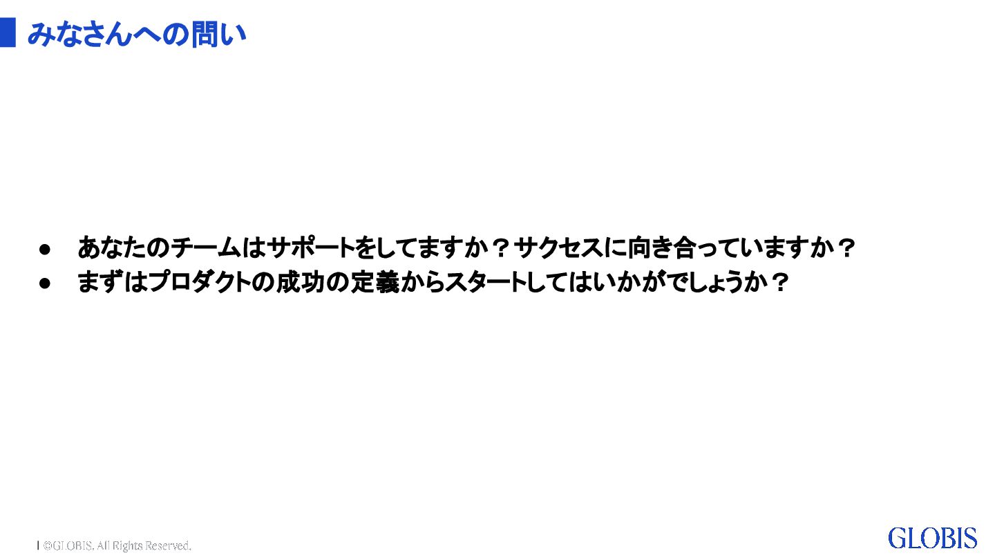 みなさんへの問い • あなたのチームはサポートをしてますか?サクセスに向き合っていますか? • まずはプロダクトの成功の定義からスタートしてはいかがでしょうか?