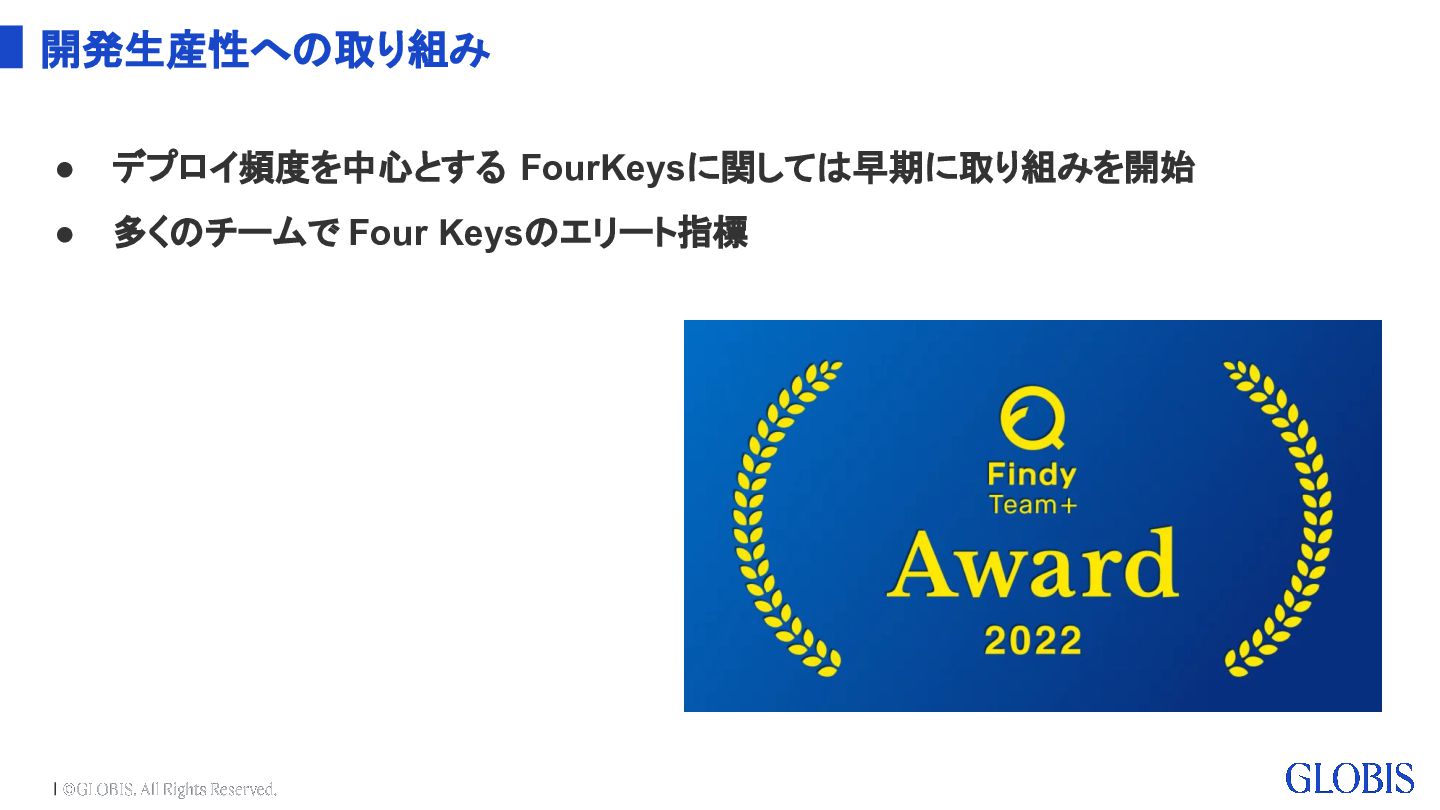 開発生産性への取り組み • デプロイ頻度を中心とする FourKeysに関しては早期に取り組みを開始 • 多くのチームで Four Keysのエリート指標
