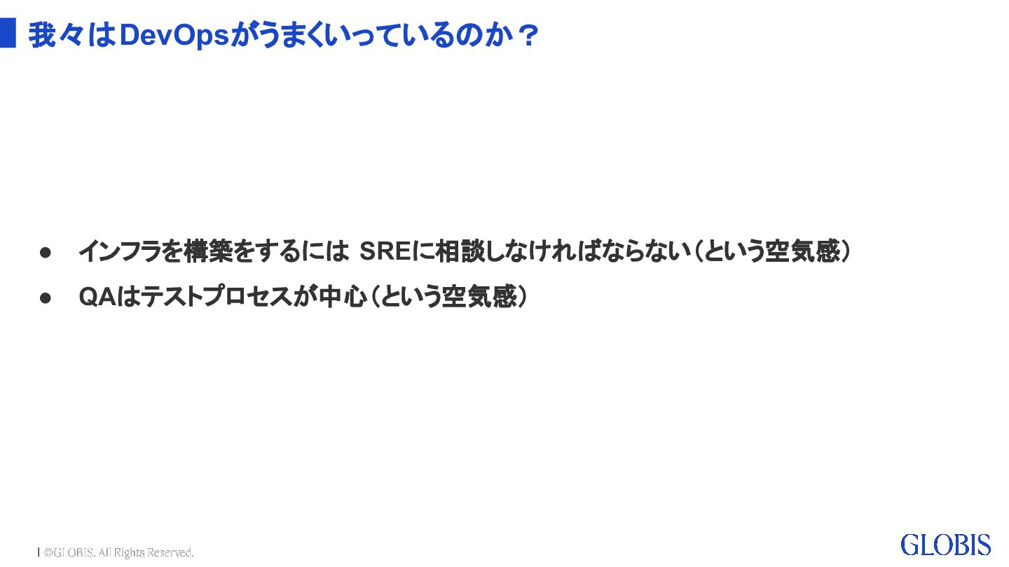 • インフラを構築をするには SREに相談しなければならない(という空気感) • QAはテストプロセスが中心(という空気感) 我々はDevOpsがうまくいっているのか?