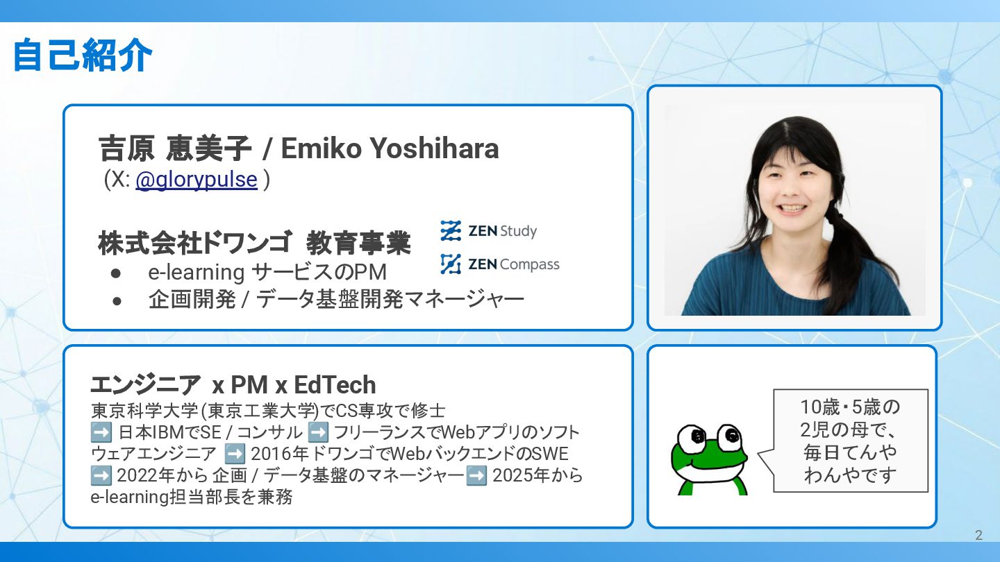 株式会社ドワンゴ 教育事業 • e-learning サービス PM • 企画開発 / データ基盤開発マネージャー エンジニア x PM x EdTech 東京科学大学 (東京工業大学)でCS専攻で修士 ➡ 日本IBMでSE / コンサル ➡ フリーランスでWebアプリ ソフト ウェアエンジニア ➡ 2016年 ドワンゴでWebバックエンド SWE ➡ 2022年から 企画 / データ基盤 マネージャー ➡ 2025年から e-learning担当部長を兼務 10歳・5歳 2児 母で、 毎日てんや わんやです