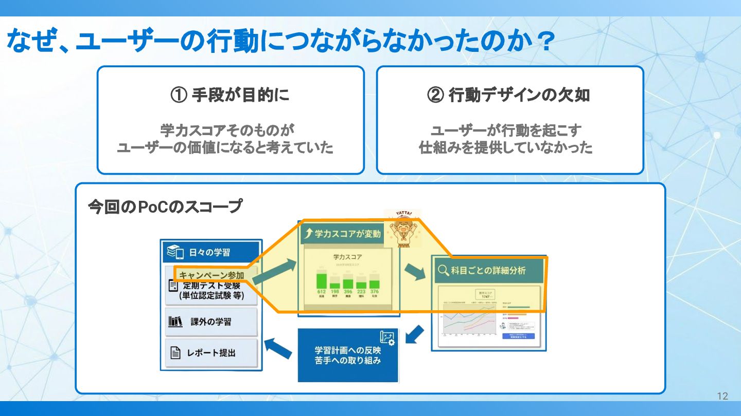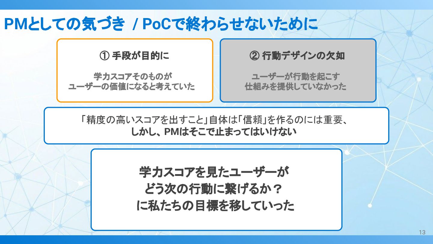 なぜ、ユーザー 行動につながらなかった か? 12 今回 PoC スコープ ① 手段が目的に 学力スコアそ