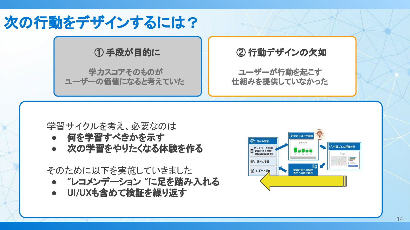 ユーザーが行動を起こす 仕組みを提供していなかった 「精度 高いスコアを出すこと」自体 「信頼」を作る に 重要、 しかし、 PM そこで止まって いけない PMとして 気づき / PoCで終わらせないために 13 学力スコアを見たユーザーが どう次 行動に繋げるか? に私たち 目標を移していった
