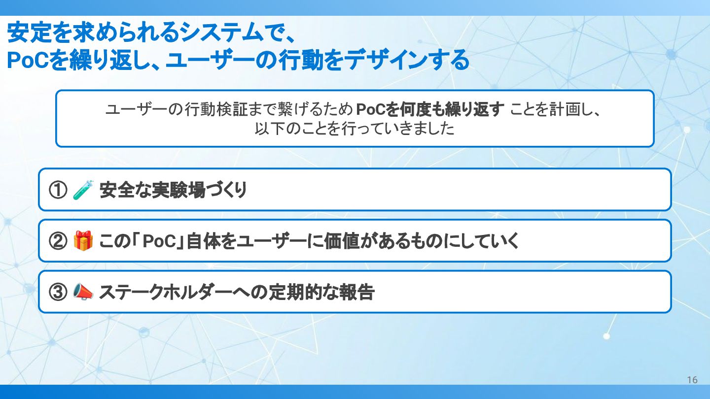 ③ 📣 ステークホルダーへ 定期的な報告 ② 🎁 こ 「PoC」自体をユーザーに価値があるも にしていく 安定を求められるシステムで、
