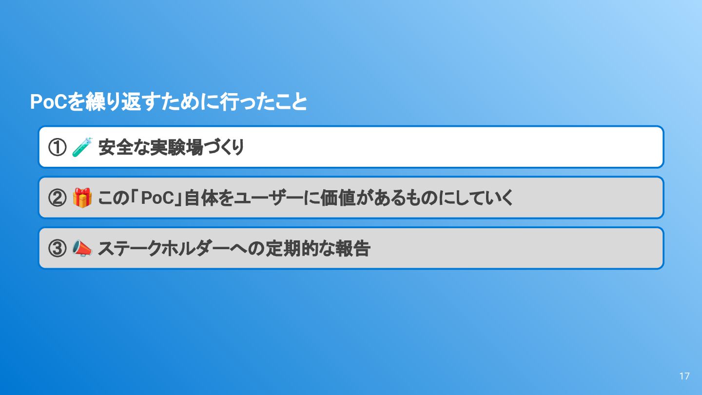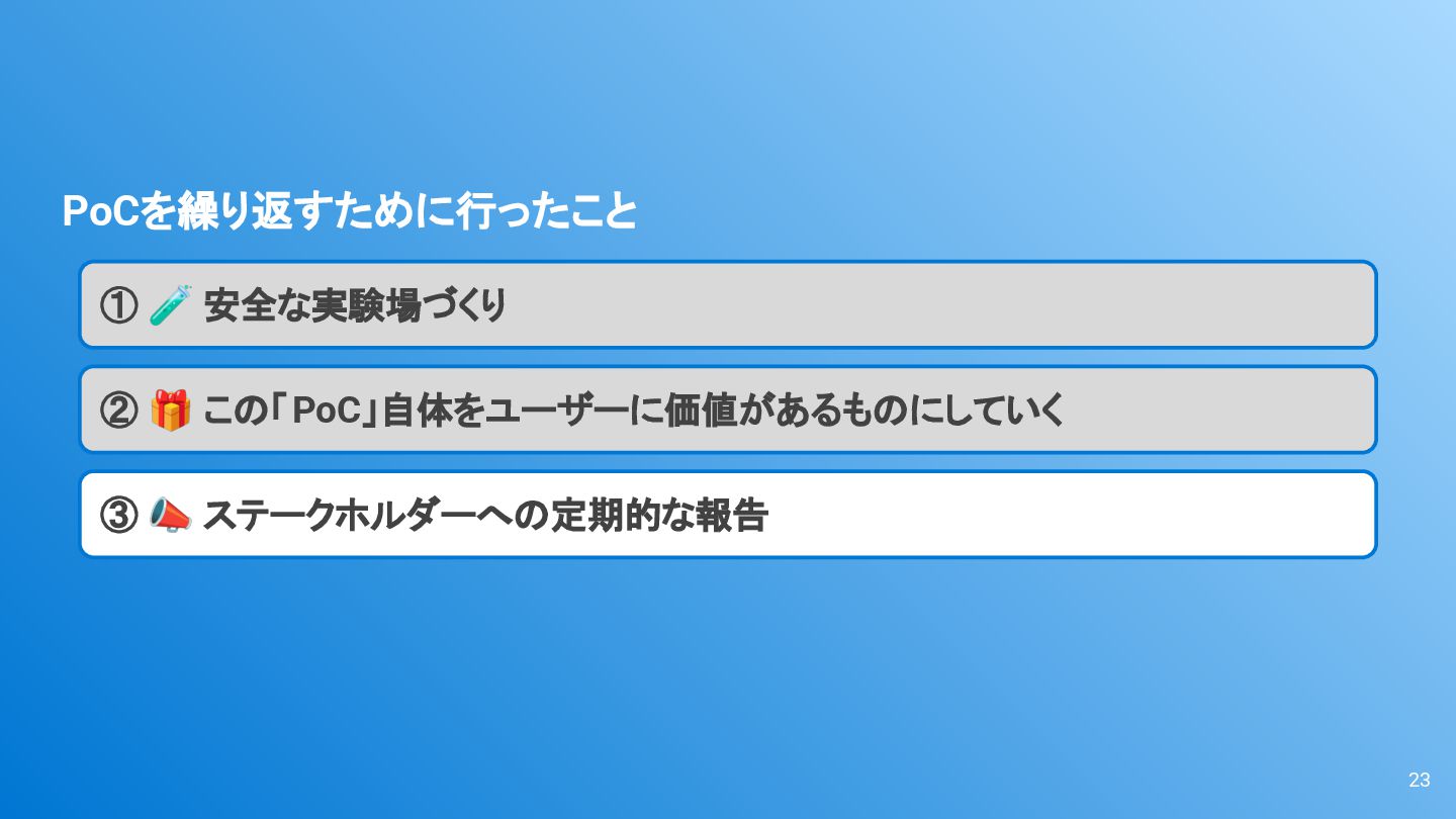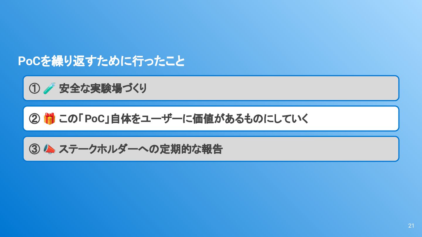 ② 🎁 こ 「PoC」自体をユーザーに価値があるも にしていく ③ 📣 ステークホルダーへ 定期的な報告 ①
