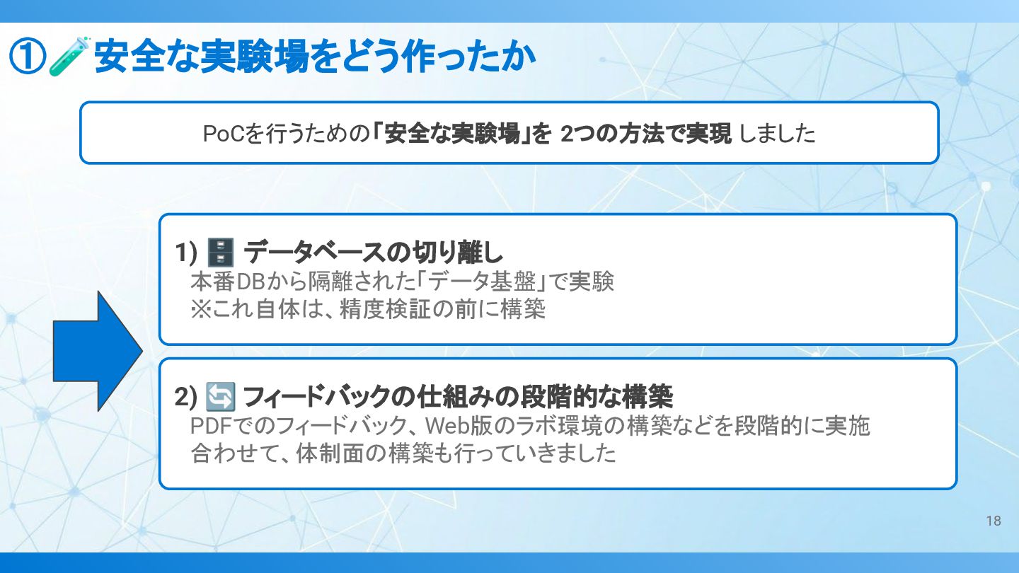 切り離し 本番DBから隔離された「データ基盤」で実験 ※これ自体 、精度検証 前に構築 2) 🔄 フィードバック 仕組み 段階的な構築 PDFで フィードバック、Web版 ラボ環境 構築などを段階的に実施 合わせて、体制面 構築も行っていきました