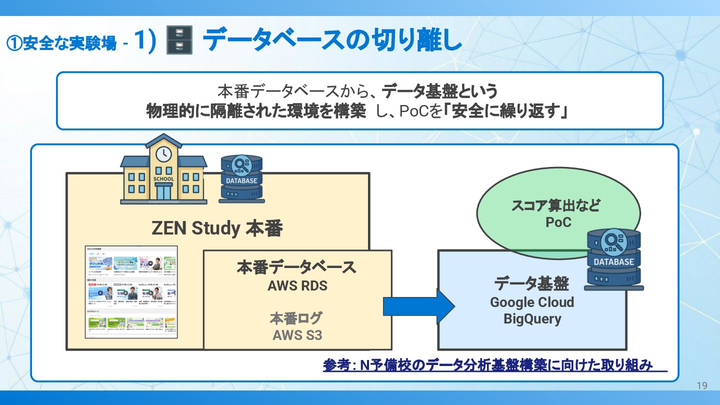 本番データベース AWS RDS 本番ログ AWS S3 データ基盤 Google Cloud BigQuery スコア算出など PoC 参考: N予備校 データ分析基盤構築に向けた取り組み 本番データベースから、データ基盤という 物理的に隔離された環境を構築 し、PoCを「安全に繰り返す」