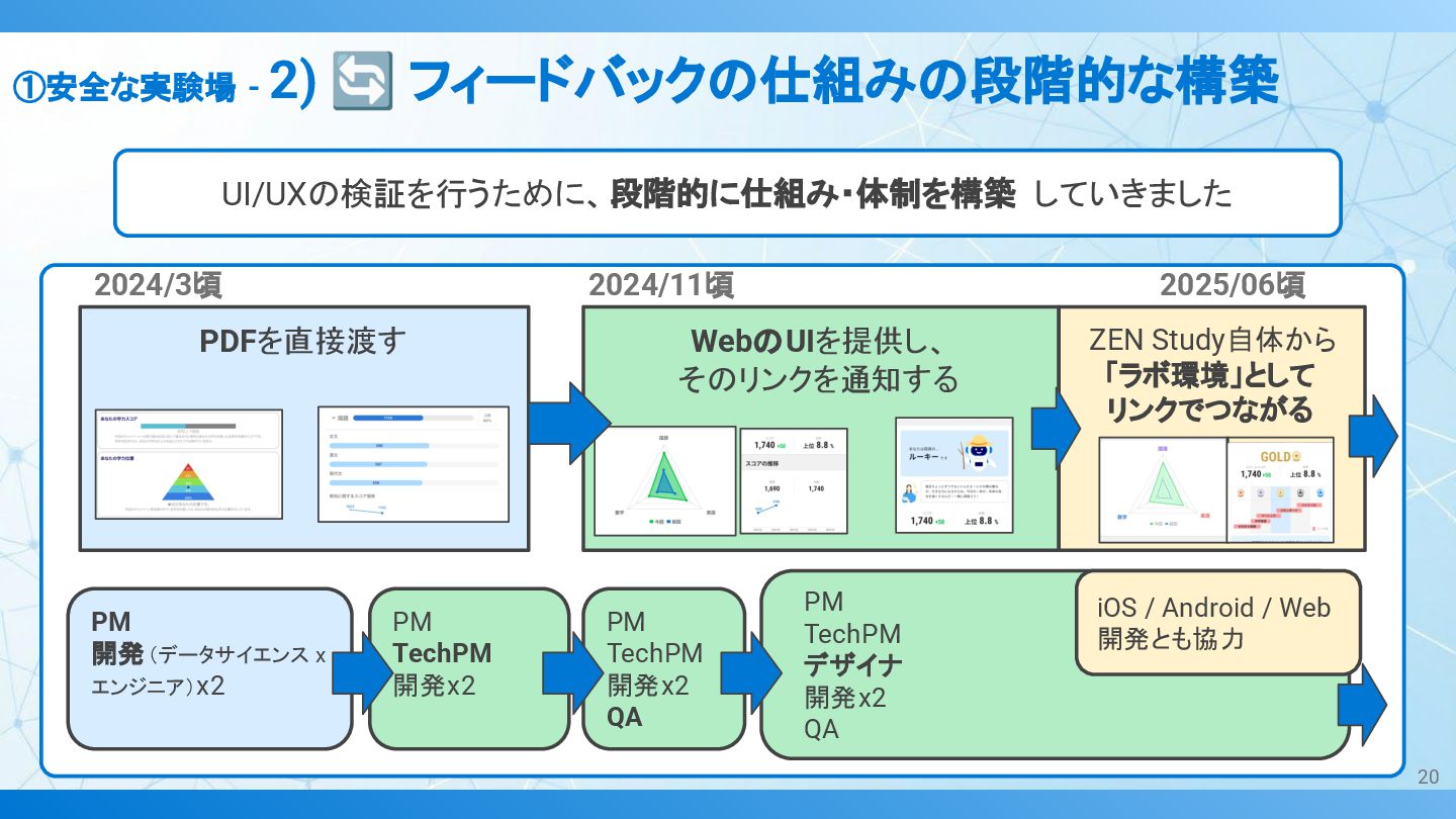 していきました PDFを直接渡す Web UIを提供し、 そ リンクを通知する ZEN Study自体から 「ラボ環境」として リンクでつながる PM 開発(データサイエンス x エンジニア)x2 PM TechPM 開発x2 PM TechPM デザイナ 開発x2 QA iOS / Android / Web 開発とも協力 PM TechPM 開発x2 QA 2025/06頃 2024/11頃 2024/3頃