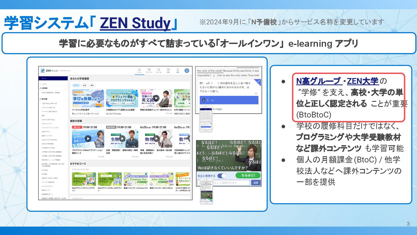・ZEN大学 “学修” を支え、高校・大学 単 位と正しく認定される ことが重要 (BtoBtoC) • 学校 履修科目だけで なく、 プログラミングや大学受験教材 など課外コンテンツ も学習可能 • 個人 月額課金(BtoC) / 他学 校法人などへ課外コンテンツ 一部を提供 ※2024年9月に 「N予備校」からサービス名称を変更しています