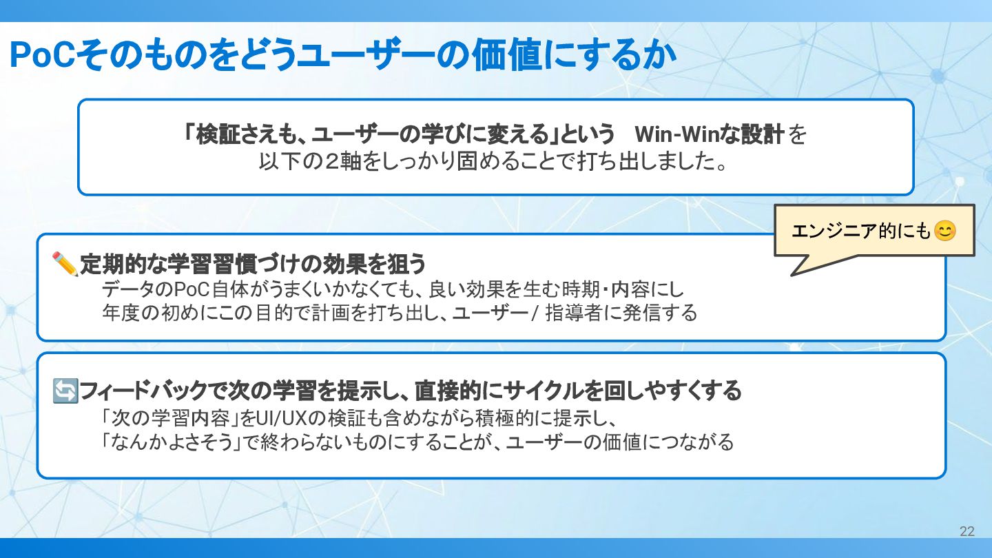 ✏定期的な学習習慣づけ 効果を狙う データ PoC自体がうまくいかなくても、良い効果を生む時期・内容にし 年度 初めにこ 目的で計画を打ち出し、ユーザー / 指導者に発信する 🔄フィードバックで次 学習を提示し、直接的にサイクルを回しやすくする 「次 学習内容」をUI/UX 検証も含めながら積極的に提示し、 「なんかよさそう」で終わらないも にすることが、ユーザー 価値につながる エンジニア的にも😊