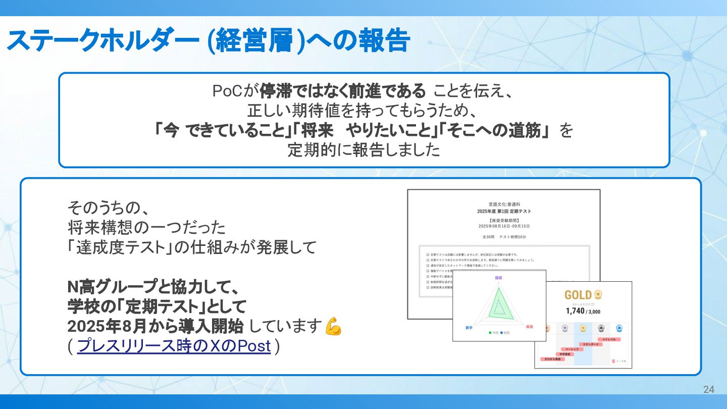 2025年8月から導入開始 しています💪 ( プレスリリース時 X Post ) ステークホルダー (経営層)へ 報告 24 PoCが停滞で なく前進である ことを伝え、 正しい期待値を持ってもらうため、 「今 できていること」「将来 やりたいこと」「そこへ 道筋」 を 定期的に報告しました