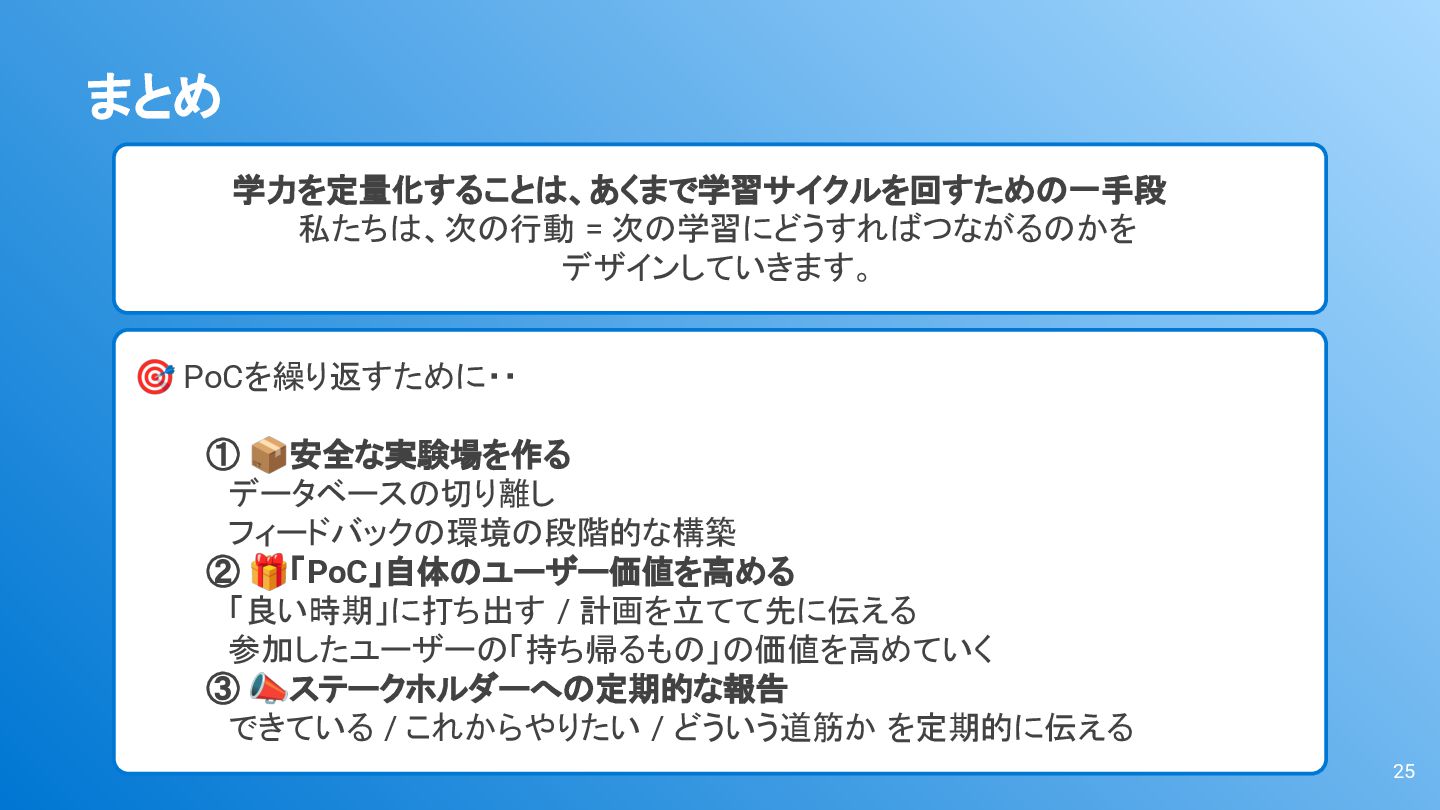学習にどうすれ つながる かを デザインしていきます。 🎯 PoCを繰り返すために・・ ① 📦安全な実験場を作る データベース 切り離し フィードバック 環境 段階的な構築 ② 🎁「PoC」自体 ユーザー価値を高める 「良い時期」に打ち出す / 計画を立てて先に伝える 参加したユーザー 「持ち帰るも 」 価値を高めていく ③ 📣ステークホルダーへ 定期的な報告 できている / これからやりたい / どういう道筋か を定期的に伝える