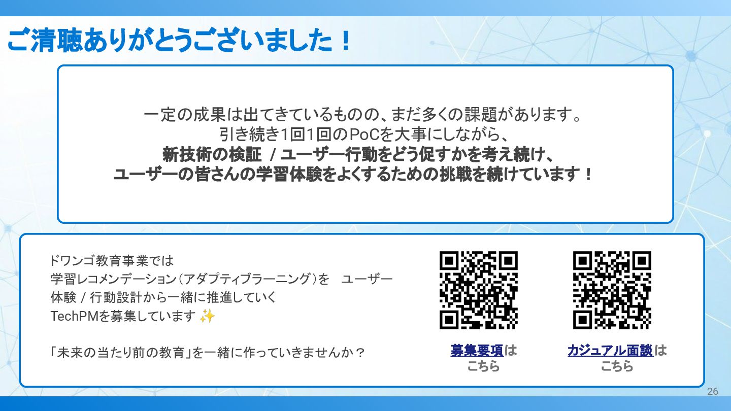 ご清聴ありがとうございました! ドワンゴ教育事業で 学習レコメンデーション(アダプティブラーニング)を ユーザー 体験 / 行動設計から一緒に推進していく TechPMを募集しています ✨ 「未来