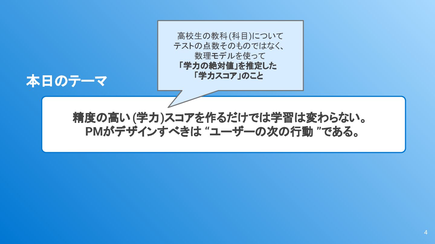 本日 テーマ 4 精度 高い (学力)スコアを作るだけで 学習 変わらない。 PMがデザインすべき “ユーザー