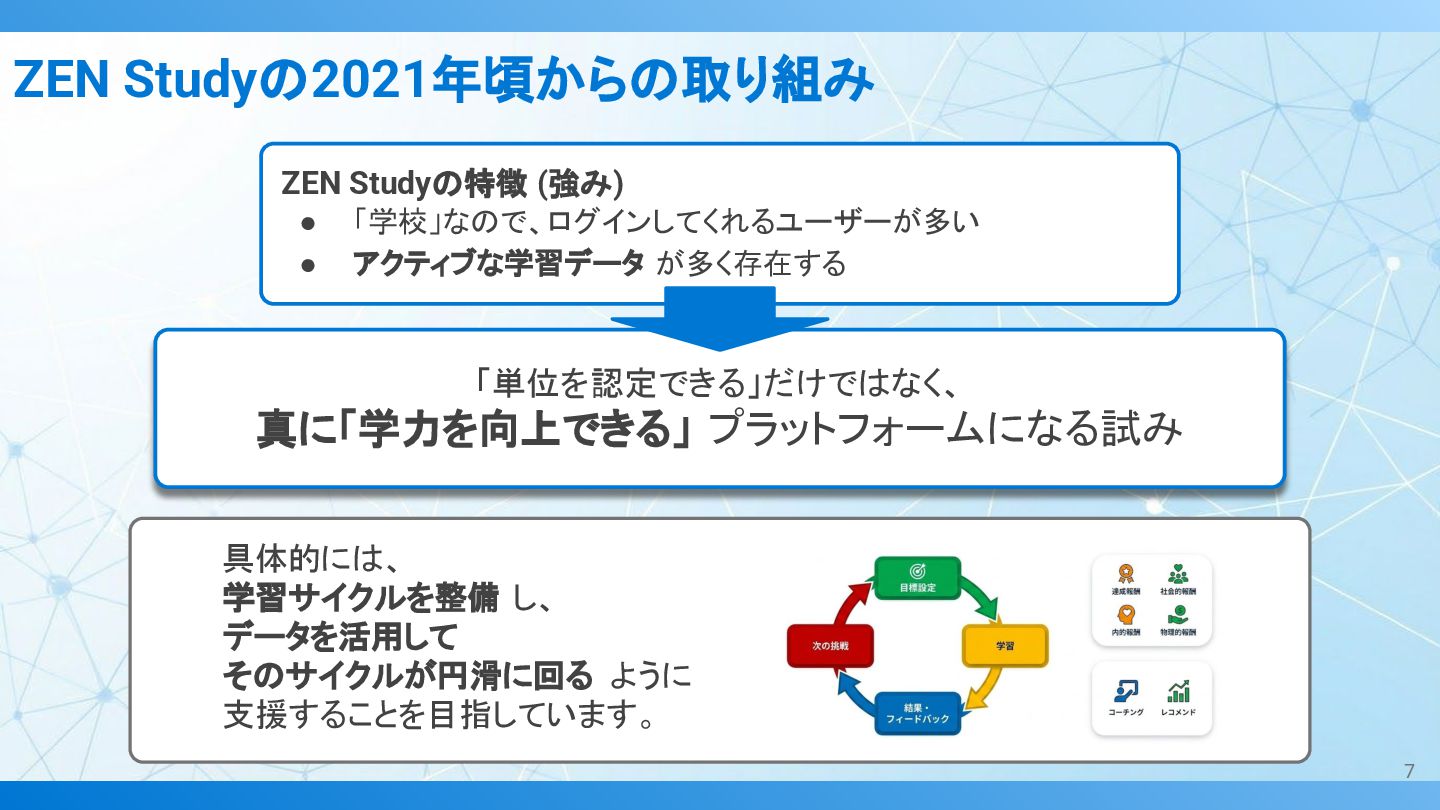 「学校」な で、ログインしてくれるユーザーが多い • アクティブな学習データ が多く存在する 「単位を認定できる」だけで なく、 真に「学力を向上できる」 プラットフォームになる試み 具体的に 、 学習サイクルを整備 し、 データを活用して そ サイクルが円滑に回る ように 支援することを目指しています。