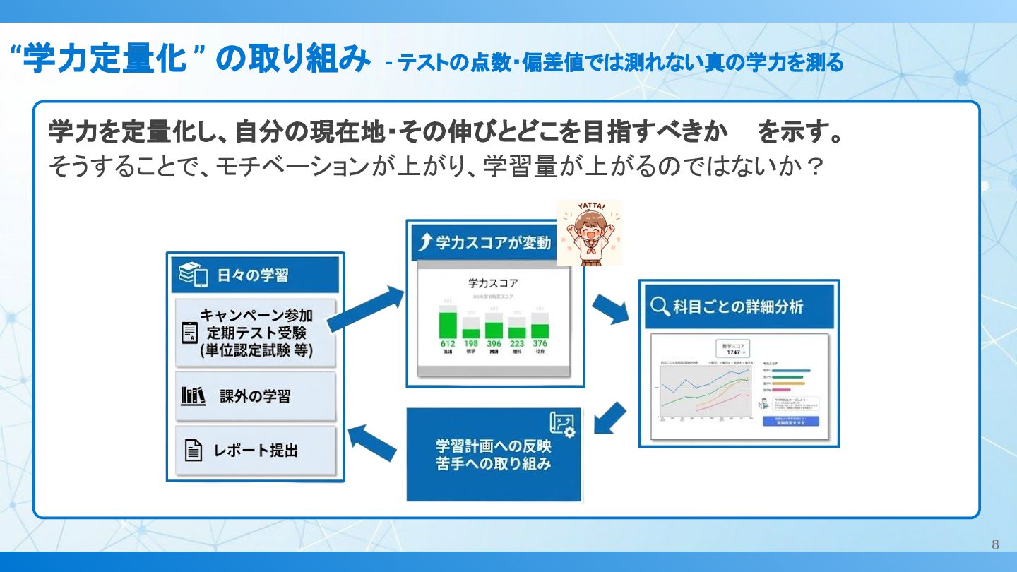 学力を定量化し、自分 現在地・そ 伸びとどこを目指すべきか を示す。 そうすることで、モチベーションが上がり、学習量が上がる で ないか? “学力定量化 ” 取り組み