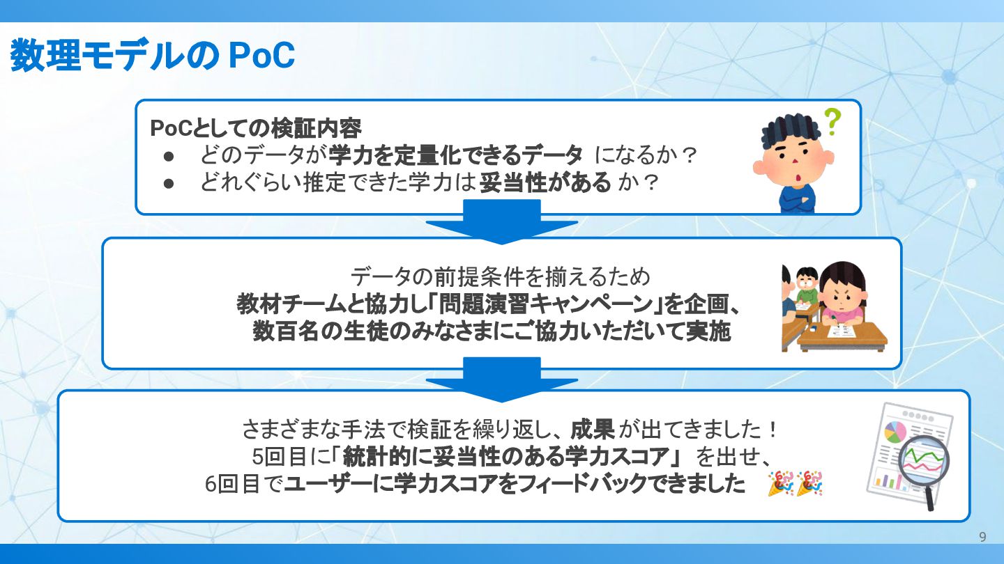 数理モデル PoC 9 PoCとして 検証内容 • ど データが学力を定量化できるデータ になるか? •