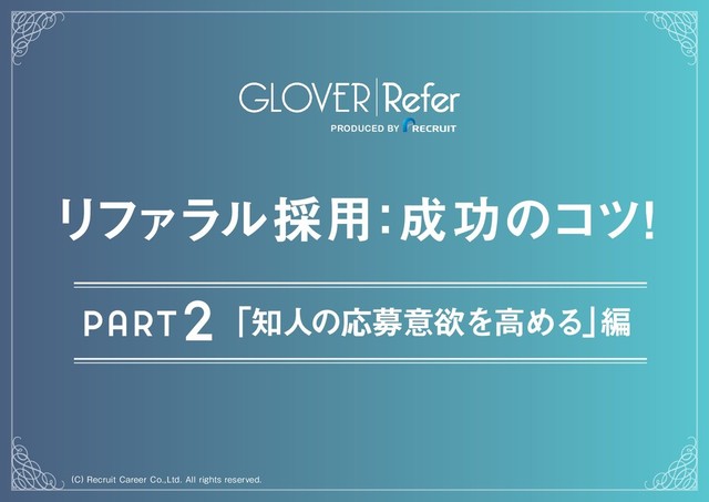 べきか? 【知人ー❷応募】 「もともと興味を持っていた」 「紹介者が信頼できる」 「イベントやオフィスに行って ・紹介者以外の社員と話して、 好感を持った」 また選考を受けた人の 70.2%は興味を持っていたわけではない企業に応募 ⇒転職者にとっての不安払拭として、 職場や社員との接点をつくるのが効果的 その会社の選考を受けたのは、どのような理由から ですか? その会社のイ ベン トやオフ ィ スに行って、その会社に好感を持ったから 19.1% 紹介者に大変世話になり恩義を感じているから 9.6% 仕事を通じて自分が成長できると思ったから 6.2% もともと興味を持っている会社・事業だったから 32.6% 話を聞くだけで紹介者や自分にメリッ ト (お金がもらえる等) がある仕組みだったから 3.4% 職場の雰囲気が良かったから 6.7% 紹介者が十分に信頼できる人物だから 30.3% 給与水準や勤務条件 (勤務時間、休日数など) が良かったから 10.7% ちょうど転職を考えているタイミングで話があったから 11.5% 紹介者以外の社員と話し て、その会社に好感を持ったから 25.8% 紹介者に熱意と本気度を感じたから 8.4% 会社が成長し ていて将来性があると思ったから 7.0% その会社とは以前から仕事の関係などで接点があり身近だったから 18.0% 美味しい料理やお酒などをおごってもらったから 3.4% オフ ィスが快適・場所が便利だったから 5.9% 紹介者に自分のことを十分に理解し てもらっているから 16.3% 自分の能力や職務経験・スキルが活かせると思ったから 9.6% 紹介だと選考が優遇されると聞いたから 2.5% その他 0.6% 調査名:リファラルカスタマー調査 調査元:株式会社リクルー トキャリア n=650