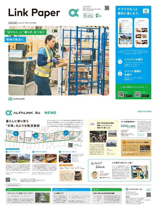 ଞʹศརͳαʔϏε͍Ζ͍Ζ ྲྀࢁ Β͠ʹدΓఴ͏ ʮʯͷΑ͏ͳ ྲྀ ࢪ ઃ (-1"-'"-*/, ΞϧϑΝϦϯΫ ྲྀࢁॆ࣮ͨ͠ઃඋΛඋ͑ͨҬͷ ʮ ʯ ͷΑ͏ͳྲྀࢪઃͰ͢ɻ ΧϑΣϨετϥϯΛඋ͑ͨςϥε੮ͷଞɺ ίϯ Ϗχίʔώʔγϣοϓ͕ೖډɻ ਓ͕ࣳෑ͖٧ΊΒΕͨ "-$0 ύʔΫ Πϕϯτར༻ՄೳͰ͢ɻ ࣄʹɺ ͍͍͜ͷ࣌ؒʹɺ ͥͻ͝׆༻͍ͩ͘͞ɻ ʮͨΒ͘ʯ ͱ ʮΒ͢ʯ Λͭͳ͙ Ҭͷڌʹ ΠϕϯτใΛ ͓ಧ͚ ແྉͷࢠΠϕϯτεϙʔπڭࣨͳͲͷ ։࠵ใΛDIFDLʂ Ӧۀ࣌ؒ "-$0ςϥε,JUDIFOɿʙ ʢॕٳۀʣ ΧϑΣɾ υɾΫϦΤɿฏʙɺ ༵ʙ ʢॕٳۀʣ ٢Ոɿฏʙ ʢॕٳۀʣ ͳ·Δ͏ͲΜɿฏʙ ʢॕٳۀʣ ϑΝϛϦʔϚʔτʗηϒϯΠϨϒϯɿ࣌ؒ ྲྀࢁ ઍ༿ݝྲྀࢁࢢೆ ൪ଞ IUUQTXXXHMQDPNKQBMGBMJOL OBHBSFZBNBWJTJUPSTHVJEFIUNM vol. 01 (-1"-'"-*/,૬ݪ גࣜձࣾ༑ۈ ؛্ΧϦʔφ͞Μ ΞϧϑΝϦϯΫ૬ݪۙॴͷδϣΪϯά ίʔεͱͯ͠ར༻͍ͯ͠·ͨ͠ɻ ݩʑԕ͘ͷ ձࣾʹ௨ۈ͍ͯͨ͠ΜͰ͕͢ɺ ࢪઃ៉ྷͰ ศརͩ͠ɺ ԿΑΓࢠͲ͕͍ΔͷͰॅΜͰ͍ ΔொͰಇ͚ͨΒ҆৺ͩͳͱࢥ͍ɺ ͜͜Ͱಇ͖ ࢝Ί·ͨ͠ɻ ྲྀͷࣄॳΊͯͰ͕ͨ͠ɺ ࣗͷࣄ͕ۙͳ୭͔ͷʹཱͬͯΔͱ͍ ͏تͼ͕͋Γ·͢ɻ ࢠͲ͕େ͖͘ͳΔ·Ͱ ɺ ͜ͷॴͰಇ͖ଓ͚͍ͨͰ͢Ͷɻ ͜ͷ ॴ ͰࣗΒ͘͠ಇ͘ 9.30 [ ] άϥϯυΦʔϓϯه೦ʂελϯϓϥϦʔ ࠓՆ͍ͭʹશ౩ͨ͠ ʮ(-1"-'"-*/, ྲྀࢁʯ ͷશମ̍ प̑LN ͷίʔεΛ८ΓελϯϓΛूΊͨํʹܠΛϓϨθ ϯτʂίʔε్தʹ͞·͟·ͳϒʔεΞτϥΫγϣϯɻ ॴ (-1"-'"-*/,ྲྀࢁʙ ࣌ؒ ɿʙɿ 10.15 [] ྩ ྲྀࢁࢢ૯߹ࡂ܇࿅ ྲྀࢁࢢओ࠵ͷ૯߹ࡂ܇࿅ʹࠓ (-1"-'"-*/, ྲྀࢁࢀ Ճ͠·͢ɻ ͞·͟·ͳࡂମݧ͕Ͱ͖Δ܇࿅Π ϕϯτͰɺ ͝Ζ͔ΒͷࡂΛߟ͑Δ ͖͔͚ͬʹ͍͔͕ͯ͠Ͱ͠ΐ͏͔ɻ ॴ ౦ਂҪখֶߍ ओ࠵ ྲྀࢁࢢ ࣌ؒ ʙɹ ˞খӍܾߦ 10.15 [] , 11.12 [] ϛχ࢛ۦΫϥϒ ࢠͰϛχ࢛ۦΛָ͠Ήί ϛϡχςΟ ʮྲྀࢁϛχ࢛ۦΫϥ ϒʯ ओ࠵ͷఆྫΠϕϯτɻ ࢀ Ճඅ ԁͰ Γ์ʂ ϨʔεձΈཱͯڭࣨɻ ʦྲྀࢁϛχ࢛ۦΫϥϒɹެࣜ'BDFCPPL ϖʔδʧ IUUQTXXXGBDFCPPLDPNOBHBSFZBNBNJOJ ॴ (-1"-'"-*/,ྲྀࢁ ࣌ؒ ɿʙɿ ༰ ࣋ͪࠐΈͰͷϑϦʔߦɺ Ϩʔεձ 2023 AUTUMN Upcoming Events Issue 01 2023 AUTUMN TAKE FREE ࠓ݄̓ɺ ྲྀࢁࢢཱරϲ࡚খֶߍͷ ੜ ʢ໊̍̎̌ʣ ͷօ͞ΜΛର ʹࣾձՊݟֶͱͯ͠ "-'"-*/, ྲྀࢁ ͷࢪઃݟֶΛ࣮ࢪ͠·ͨ͠ɻ ࣾձΛ ࢧ͑Δྲྀͷؔ৺͕ߴ·Δࠓɺ ྲྀࢪઃ͕ͲͷΑ͏ʹਐԽ͍ͯ͠Δ͔ Λࢪઃ෦Λݟͳ͕Βֶश͠·ͨ͠ɻ ࣮ࢪ ݄ ॴ (-1"-'"-*/, ྲྀࢁ ॳΊͯݟΔྲྀͷݱ ՙͬͯ͜͏ͬͯ ӡΕͯಧ͘Μͩ EVENT REPORT Ұൠͷํ͚ དྷऀҊ23 Ұൠར༻ɾཱ͓ͪدΓՄೳͳࢪઃ 1Ϩε τϥϯɹ2ٳܜϥϯδɹ3ϫʔΫεϖʔεɹ4 ϤΨεϖʔε 5ӡಈίʔ τɹ6ԾϧʔϜɹ7ୗࣇॴɹ8্ςϥεɹ9্లɹ ࢪઃͰಇ͘ਓ͚ͷࢪઃɾઃඋ ˔Ϩε τϥϯɹ˔ΧϑΣ ɾ υ ɾ ΫϦΤɹ˔ແਓചళɹ˔γϟϫʔϧʔϜ ɹ ˔ALCOύʔΫ ˔Ϩε τϥϯɹ˔٢Ոˍͳ·Δ͏ͲΜɹ˔ηϒϯΠϨϒϯɹɹ ˔ϫʔΫεϖʔε ɹ˔γΣΞΩονϯɹ˔γϟϫʔϧʔϜ ˔ϑΝϛϦʔϚʔ τɹ ˔γϟϫʔϧʔϜɹ ˔ϥϯδεϖʔεɹ ˔λΠϜζΧʔγΣΞ "OESPJE ൛ (PPHMF1MBZε τ Ξ J04 ൛ "QQ4UPSF ALFALINK presents RADIO LINK ์ૹہɿ'.ϤίϋϚ ʢ.)[ʣ ์ૹ࣌ؒɿຖि༵ʙ ϥδΦ%+ɿখྛઍ Β͠Λࢧ͑Δ ʮྲྀʯ ΛΩʔϫʔυʹɺ Ϧεφʔͷ͋ͳͨͱ͕֗ܨ͕ΔใΛ ͓ಧ͚͢Δ൪Ͱ͢ɻ ʮྲྀʯ ͱฉ͘ͱ Χλ͍ΠϝʔδΛ͕࣋ͪͪͰ͕͢ɺ ࣮ ࢲͨͪͷੜ׆ʹͬۙ͘͢͝ɻ ͖ͬͱɺ Εָ͘͠ͳΔʹҧ͍͋Γ·ͤΜɻ ͦ Μͳͱ͜Ζ͔Βࢲͨͪͷ৽͍͠Β͠ Ώͬ͘Γ͡·ΔͷͩΖ͏ͱ͍͏͍͔ Βɺ ͜ͷ൪ελʔτ͠·ͨ͠ʂ ϥδΦ൪์ૹதʂ ʮྲྀʯ ΛΩʔϫʔυʹɺ Ϧεφʔͷ͋ͳͨͱ͕֗ ܨ͕ΔใΛ͓ಧ͚ʂ Link paper issue 01 ൃߦʗ ݄ɹ ൃߦݩʗ(-1"-'"-*/, ྲྀࢁ ʢຊ (-1 גࣜձࣾʣ IUUQTXXXHMQDPNKQ "ɾ#ɾ$͍ͣΕͷεϖʔε8J'Jɾిݯ͋Γɻ றंʹݶΓ͕͋ΔͷͰెาࣗసंͰͷདྷΛ͓͢͢Ί͠·͢ɻ ӡӦ࣌ؒͳͲͷৄࡉެࣜ)1Ͱ֬͝ೝ͍ͩ͘͞ɻ ΧϑΣϨετϥϯ ʮ"-$0 ςϥε ,JUDIFOʯ Λඋ͑ͨ "-'"-*/, ྲྀࢁͰ࠷͍ςϥεεϖʔεͰ͢ɻ बۀऀҎ֎ʹɺ ۙྡʹ͓ ॅ·͍ͷֶੜϦϞʔτϫʔΧʔͳͲ༷ʑͳํʹ͝ར༻͍͍ͨͩ ͍ͯ·͢ɻ Τϯτϥϯεલʹ͋Δ "-$0 ύʔΫ ʢਓࣳͷʣ ͰΩονϯΧʔͷग़ళɺ ֤छΠϕϯτͳͲΛ։࠵͍ͯ͠·͢ɻ ϨετϥϯʹՃ͑ͯɺ ٢Ոɺ ͳ·Δ͏ͲΜɺ ηϒϯΠϨϒϯ ͳͲͷҿ৯ళ͕ଗ͏໌Δ͘։์తͳεϖʔεɻ γΣΞΩονϯε ϖʔεɺ ೖډاۀݩஂମͷΠϕϯτͳͲʹ׆༻͞Εͯ ͍·͢ɻ ·ͨɺ ݸࣨϒʔεɺ ूத࡞ۀϒʔεɺ ԾϒʔεΛඋ ͨ͠ϫʔΫεϖʔεΛઃஔɻ ࣄษڧʹɺ ͥͻ͝׆༻͍ͩ͘͞ɻ "-$0ςϥε ʢྲྀࢁ ʣ " "-$0ςϥε ʢྲྀࢁ ʣ # γϟϫʔϧʔϜɺ ίϯϏχʹྡ ͨ͠։์తͳεϖʔεͰ͢ɻ ϥϯδεϖʔεʢྲྀࢁʣ $ ྲྀࢁࢢΛϗʔϜλϯͱ͢Δॳͷ6όε έο τϘʔϧΫϥϒνʔϜ ʮ$BUDI7PJDFʯ ͕ɺ (-1"-'"-*/,ྲྀࢁͰεΫʔϧ׆ ಈΛ։࢝ɻ εΫʔϧࢀՃऀΛืूதͰ͢ɻ όεέεΫʔϧϝϯόʔืूத 6,000ԁʙ ݄ձඅ ΞϧϑΝϦϯΫबۀऀ͝ՈಛผׂҾ ԁʙ IUUQTXXXDBUDIWPJDFT DPNBDBEFNZ 2 POINT Ϩετϥϯׂ͕Ҿ ϦʔζφϒϧͳϦϯά౩ϨετϥϯΛ͞Βʹ ׂ҆Ձ֨ͰΩϟογϡϨεΦʔμʔɻ ຖมΘΔϝχϡʔΛDIFDLʂ 1 POINT Ҭ पล ΞΫηε."1ͪ͜Β ैۀһઐ༻ͷٳܜεϖʔε "-'"-*/, ྲྀࢁʹ֤౩͝ͱʹɺ ैۀһ ઐ༻ͷٳܜϥϯδϨετϥϯ͕ผ్ ͋Γ·͢ɻ ಇ͘ਓͷΣϧωε্ͷͨ ΊշదͰચ࿅͞ΕͨσβΠϯΛऔΓೖΕ ͓ͯΓɺ ͜͜Ͱಇ͖͍ͨͱࢥͬͯΒ͑Δ Α͏ͳࢪઃͮ͘ΓΛࢦ͍ͯ͠·͢ɻ ྲྀࢪઃ ʢྲྀࢁʣ ྲྀࢪઃ ʢྲྀࢁʣ ྲྀࢪઃ ʢྲྀࢁʣ ྲྀࢪઃ ʢྲྀࢁʣ ྲྀࢪઃ ʢྲྀࢁʣ ྲྀࢪઃ ʢྲྀࢁʣ 8 1 7 2 1 9 1 5 1 2 2 3 4 9 " # $ 7 6 9 ྲྀࢪઃ ʢྲྀࢁʣ ྲྀࢪઃ ʢྲྀࢁʣ Ӧۀ࣌ؒʹ ͍ͭͯͪ͜Β